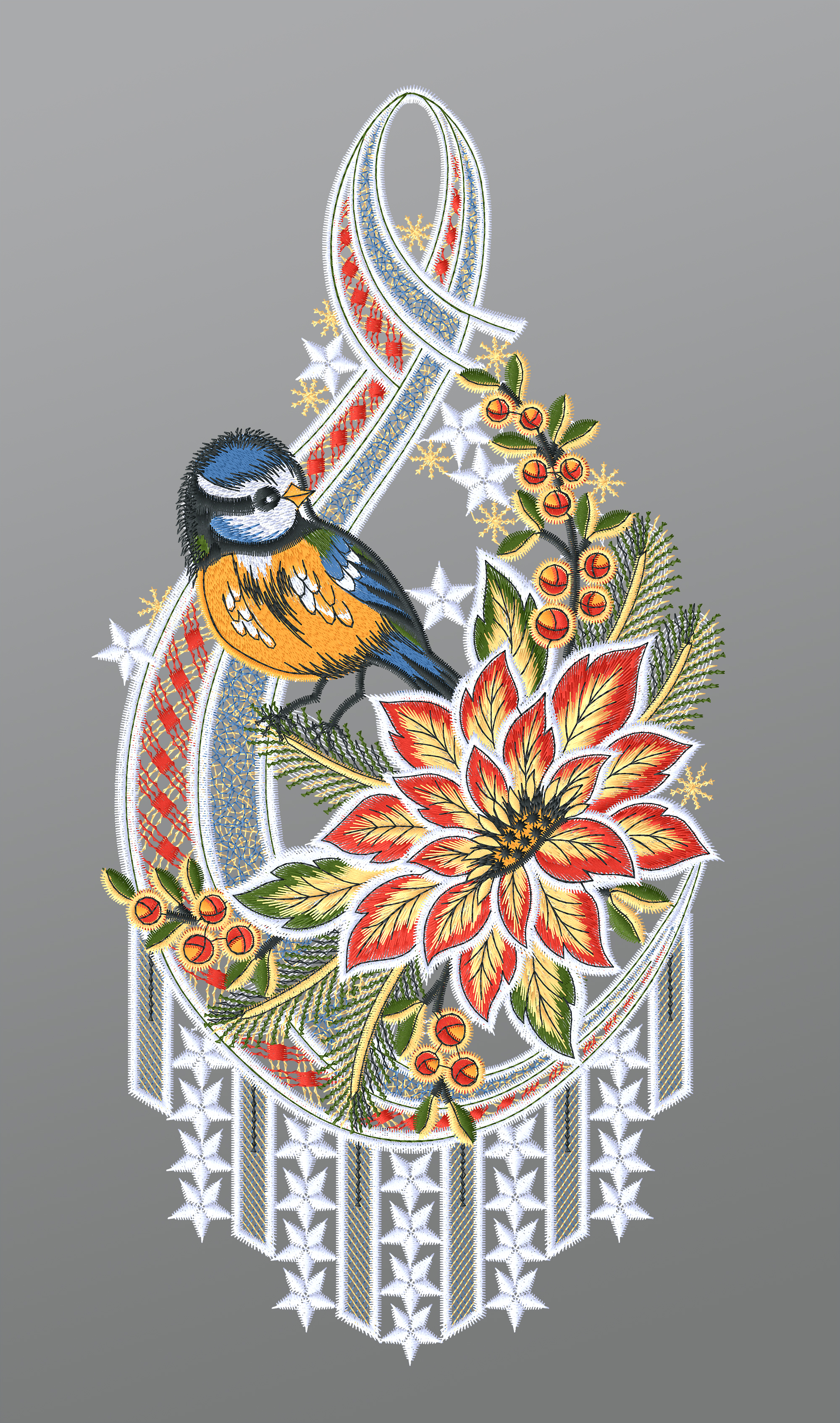 Fensterbild aus Plauener Spitze® - Blaumeise mit Weihnachtsstern #1W mehrfarbig
