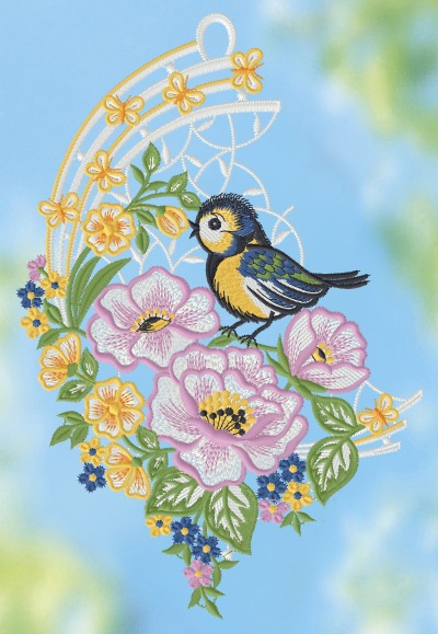 In diesem Fensterbild von Plauener Spitze® ist eine entzückende Blaumeise zu sehen, die auf einem Blumenarrangement ruht. Die fließenden Formen verleihen dem Raum Dynamik und Lebhaftigkeit. Die Vielfalt der Blumen stellt die Schönheit der Natur dar, die den kleinen Vogel zu begeistern scheint. Die rosafarbenen Blüten, die an Hibiskus erinnern, stechen besonders hervor und verleihen dem Fensterbild ein frisches, frühlingshaftes Flair. Das ansprechende Design zeichnet sich durch weiße Elemente und auffällige gelbe Blumen aus, die entlang des gesamten Bogens angeordnet sind und eine spielerische Note vermitteln.