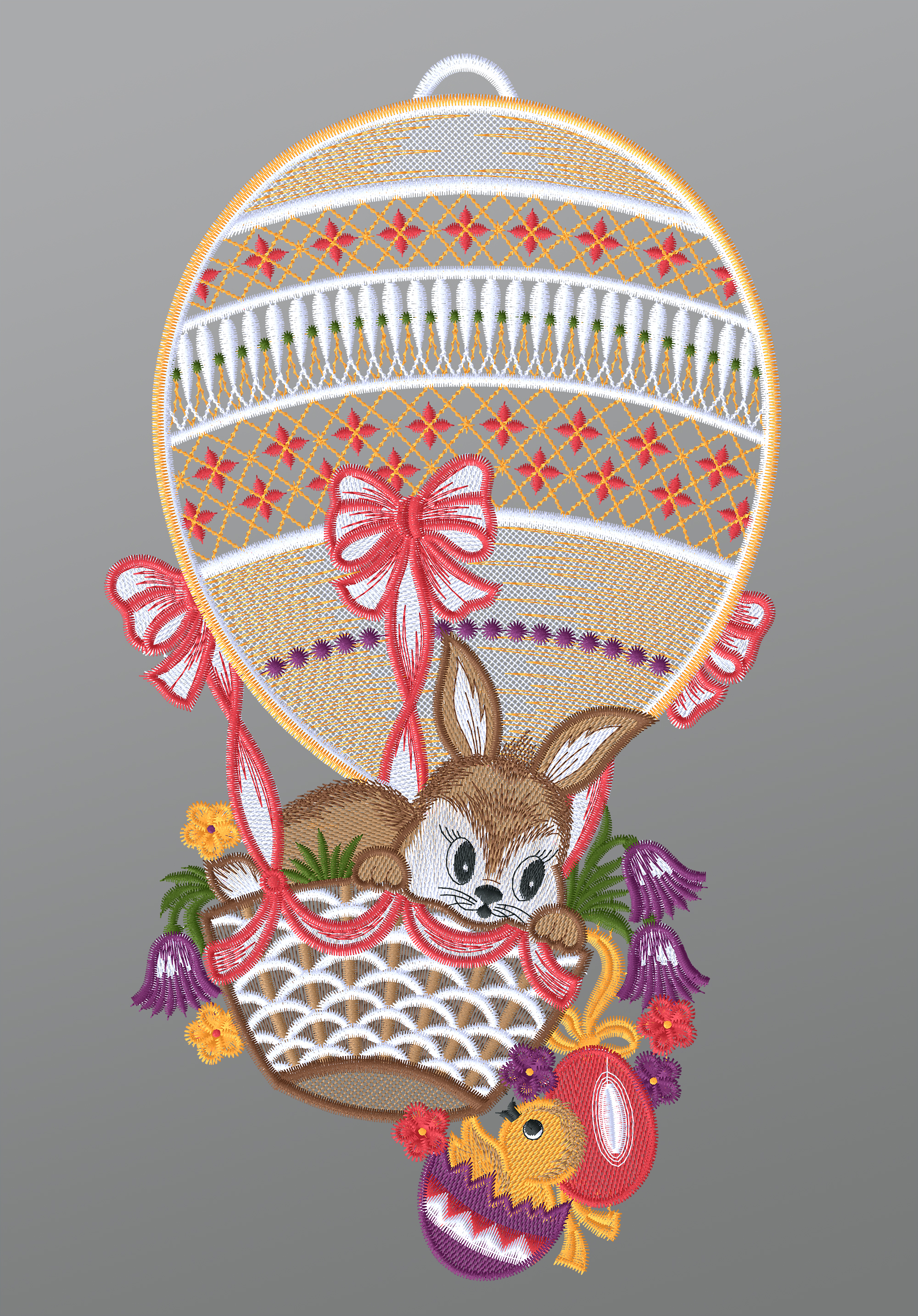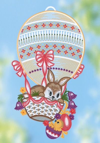 Fensterbild aus Plauener Spitze® - Hase im Heißluftballon und Küken #1W mehrfarbig
