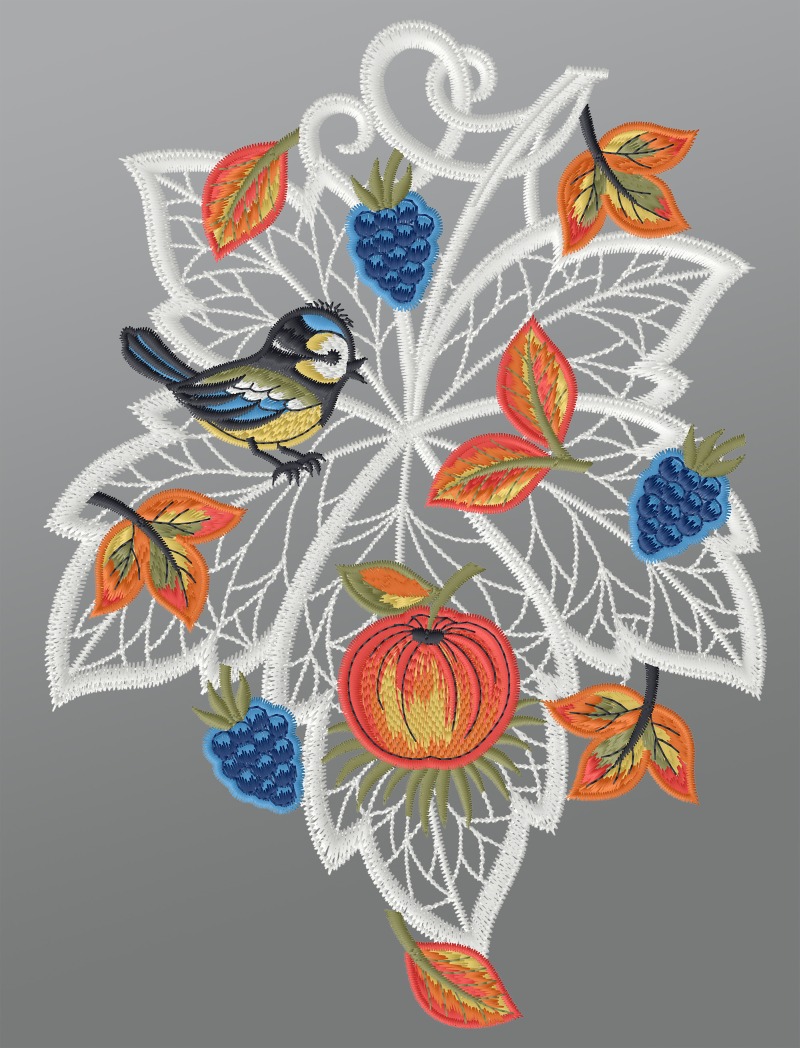 22,45 EURFensterbild aus Plauener Spitze® - Herbstblatt mit Blaumeise #1W mehrfarbig