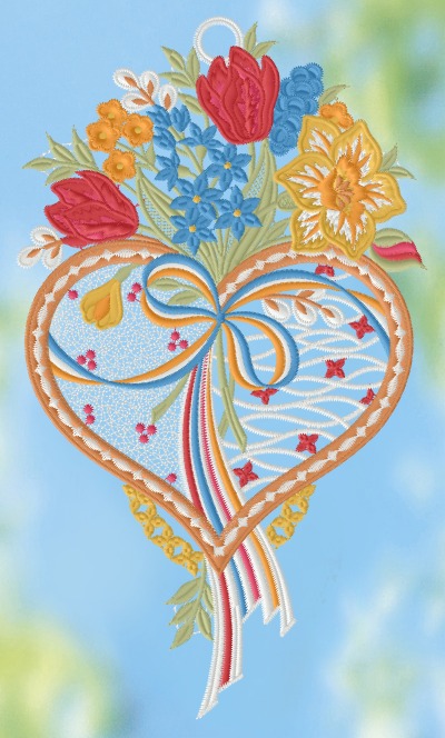 Das lebhaft gestaltete Fensterbild von Plauener Spitze® sticht mit seinen vielfältigen Farben sofort ins Auge. Auf den ersten Blick könnte es manchen an ein Lebkuchenherz erinnern. Die linke Seite ziert ein feines Fadengeflecht, während auf der rechten Seite starke Wellenlinien für Dynamik sorgen. Die bunte Schleife in Rot, Blau, Pink und Orange, deren Bänder sich elegant zur Seite kräuseln und unten über das Bild hinausragen, erinnert an einen Regenbogen und verleiht dem Fensterbild zusätzliche Länge. Unten ist zudem eine goldene Kette zu sehen. Über dem herzförmigen Mittelstück thront ein Arrangement aus Tulpen, Lupinen, Weidenkätzchen sowie weiteren kleinen blauen und gelben Blumen.