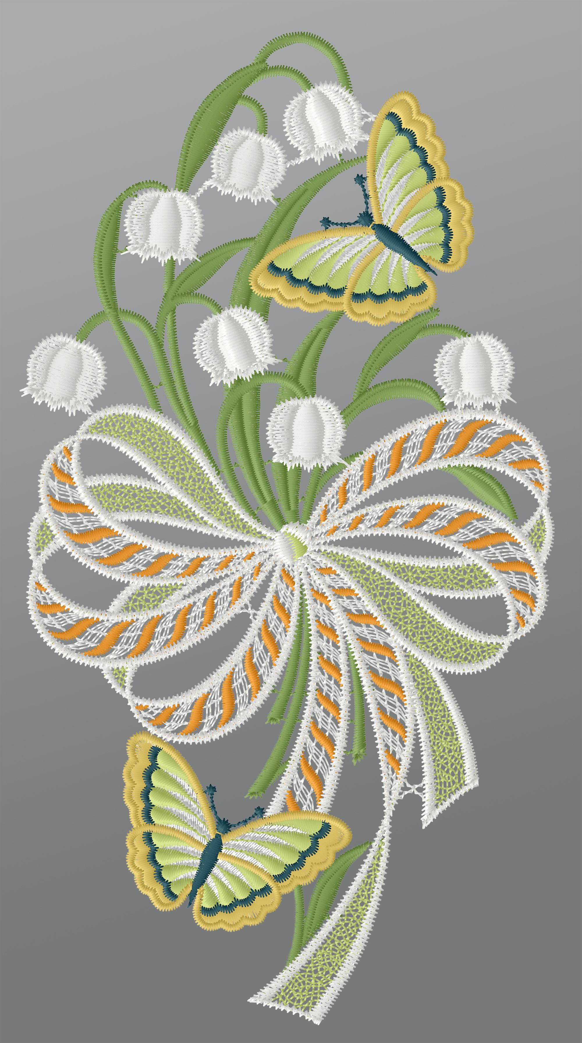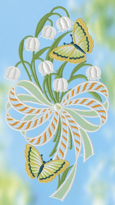 Fensterbild aus Plauener Spitze® - Maiglöckchenstrauß mit Schleife #1W mehrfarbig