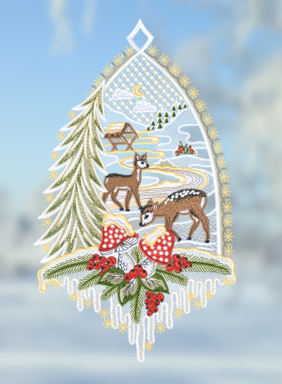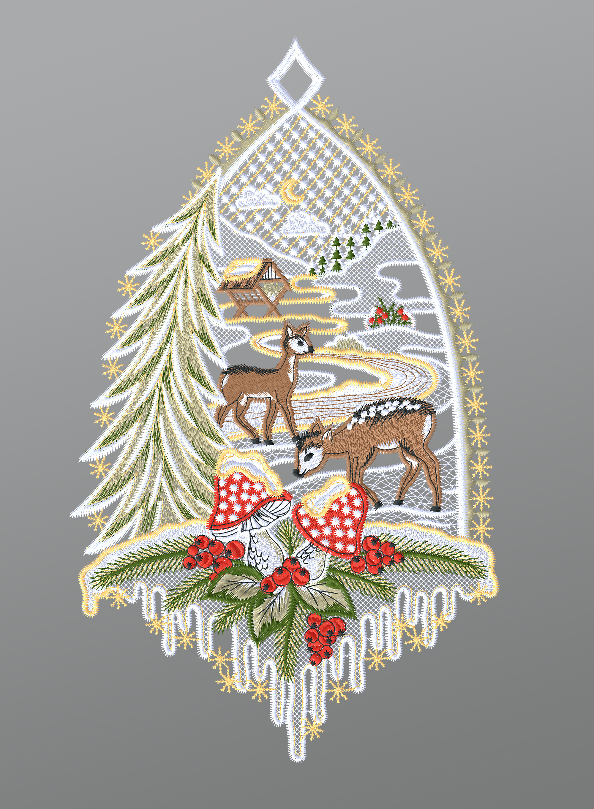 Das Fensterbild ist glockenförmig und zeigt herabhängende Eiszapfen am unteren Rand sowie eine schneebedeckte Tanne am linken Rand. Zwei Fliegenpilze, Blumen und Blätter schmücken den unteren Abschluss. Im Fokus stehen zwei Rehe auf schneebedeckten Feldern neben einer Futterkrippe. Zwei Wolken verdecken fast den Mond. Das Fensterbild aus Plauener Spitze® verbreitet eine warme Winteratmosphäre. Ideal für Ihr Zuhause.