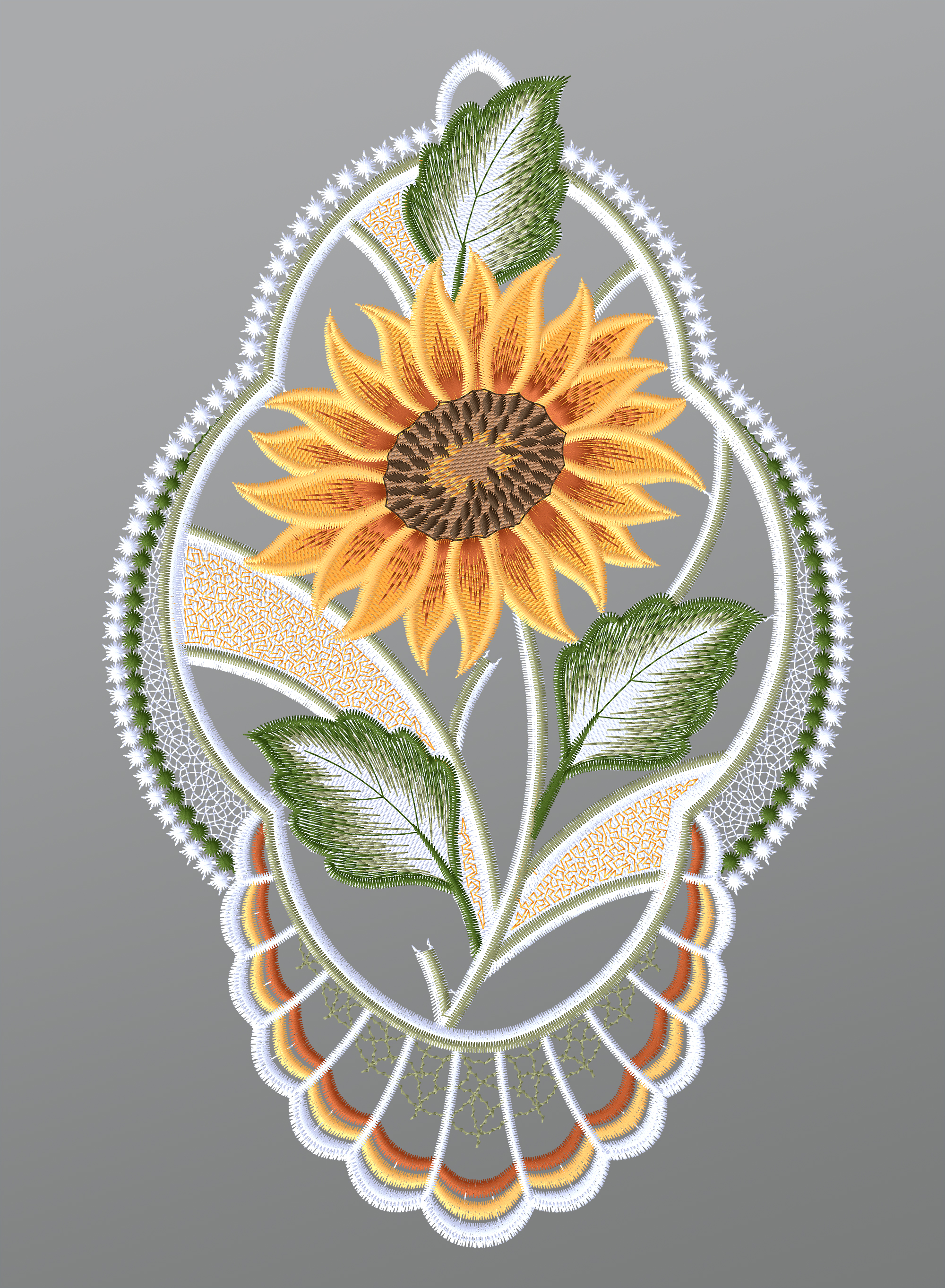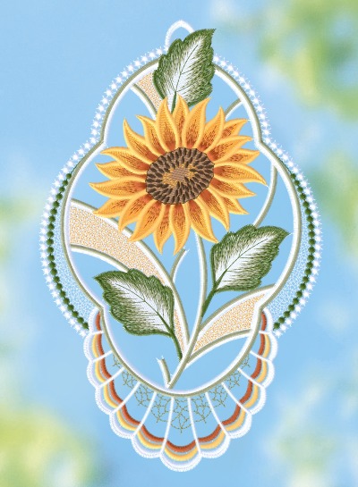 Fensterbild aus Plauener Spitze® - Sonnenblume im Zierrahmen #1W mehrfarbig