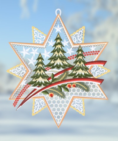 Fensterbild aus Plauener Spitze® - Tannenbäume mit Sternen #1W mehrfarbig