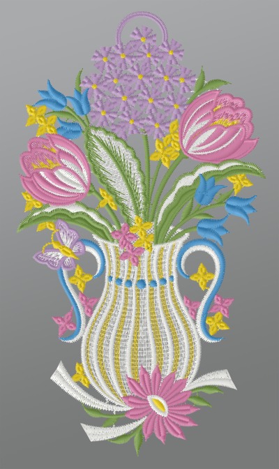 Fensterbild aus Plauener Spitze® - Vase mit Frühlingsblumen #1W mehrfarbig