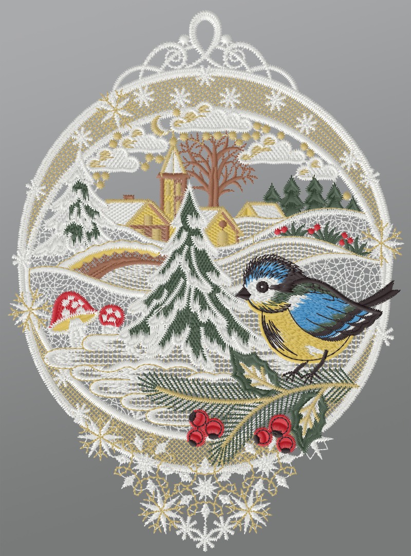 21,95 EURFensterbild aus Plauener Spitze® - Blaumeise mit Stern und Glocken #1W mehrfarbig