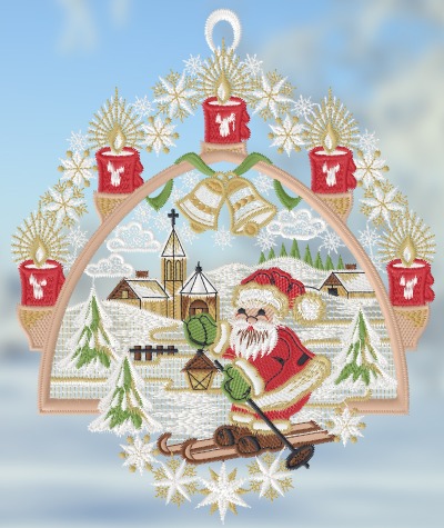 Das Fensterbild von Plauener Spitze® zeigt einen beeindruckenden Schwibbogen, der von großen, leuchtend roten Kerzen mit strahlendem Licht umgeben ist, umrahmt von verschiedenen Sternenformen. Über dem Bogen schweben zwei goldene Weihnachtsglocken, die an einem grünen Band hängen. Der Schwibbogen umrahmt eine malerische Winterlandschaft mit einer Dorfkirche, verschneiten Feldern und Tannenbäumen. In dieser Szene ist der Weihnachtsmann zu sehen, der fröhlich auf Skiern unterwegs ist und sich von einer Laterne den Weg erhellen lässt. Dieses bunte und detailreiche Fensterbild mit seinen zauberhaften Verzierungen und festlichen Dekorationen fasziniert seine Betrachter und bringt weihnachtliche Stimmung und glänzende Eleganz in den Raum.