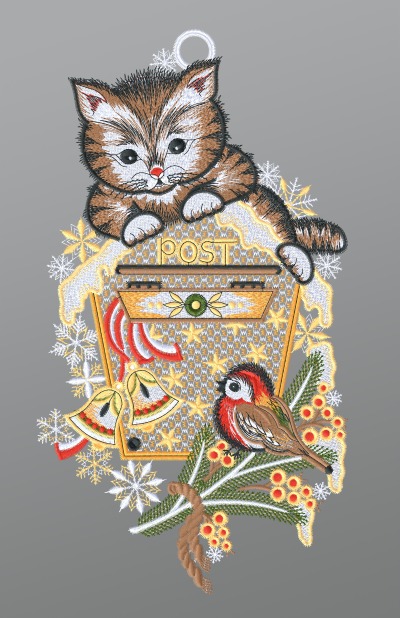 21,45 EURFensterbild aus Plauener Spitze® - Kätzchen mit Vogel und Briefkasten #1W mehrfarbig