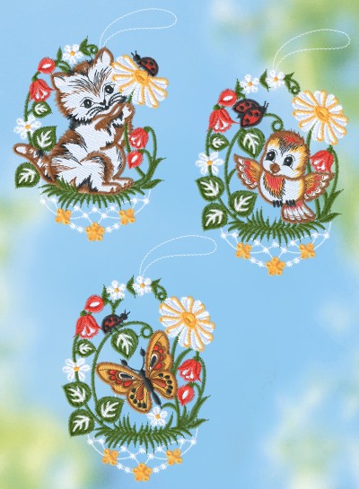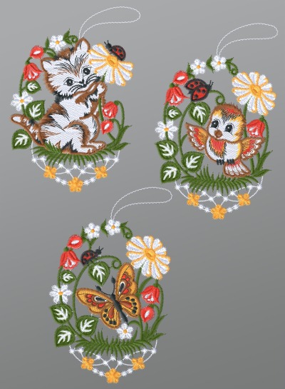 Fensterbilder aus Plauener Spitze® - 3er SET Tierisches Trio #1W mehrfarbig