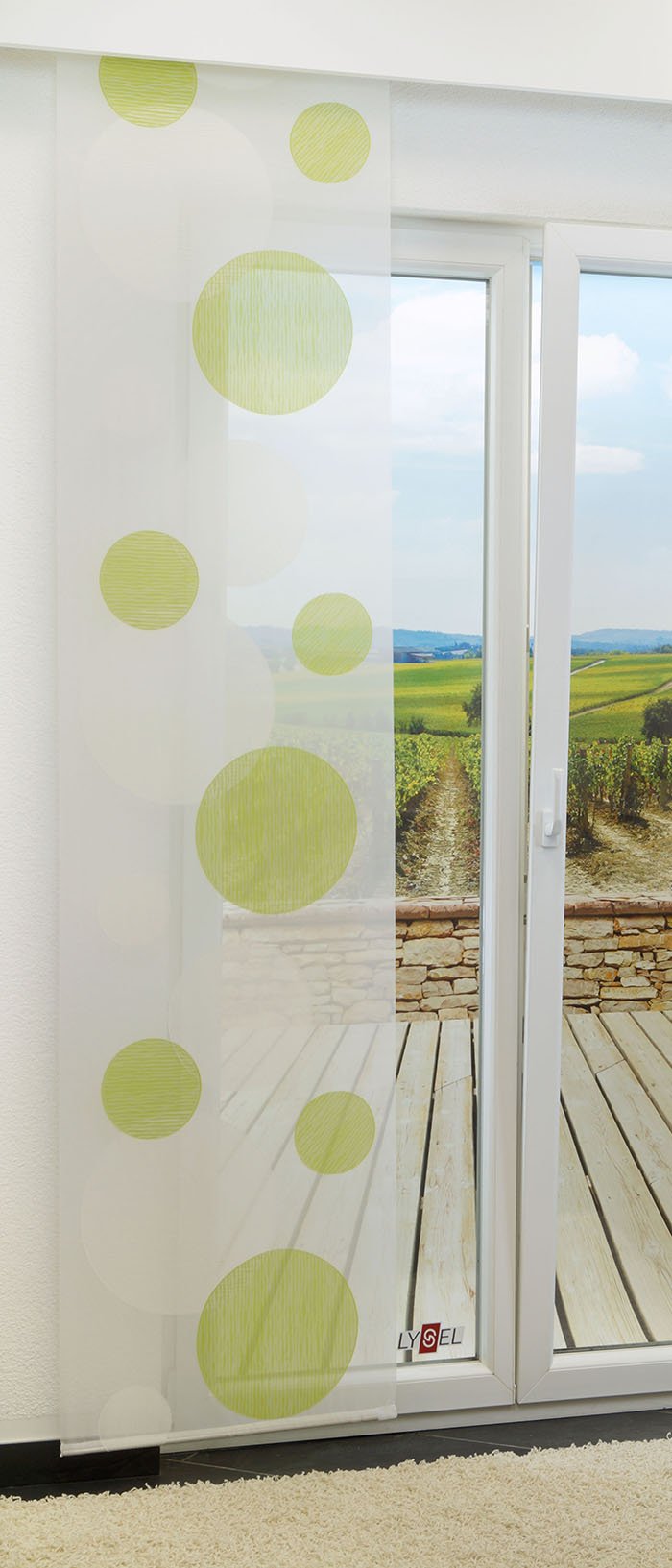 Erfrischend und vitalisierend wirken die leuchtend grünen Kreise auf dem weißen Stoff. Inspiriert von Apfel-, Kiwi- und Limettengrün erweckt diese Schiebegardine den gesamten Raum zum Leben. In Verbindung mit rötlichem oder hellem Holz sowie sanften Naturfarben wirkt die Schiebegardine wunderbar harmonisch. Extravagant wird es mit starken Violetttönen, Dunkelblau oder Anthrazit; bunt, frühlingshaft und fröhlich mit Rosa, Gelb oder Orange.