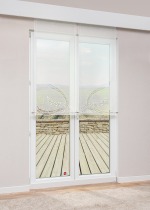 - Eine Schiebegardine (Paneel links) aus transparentem Stoff, 100% Polyester.