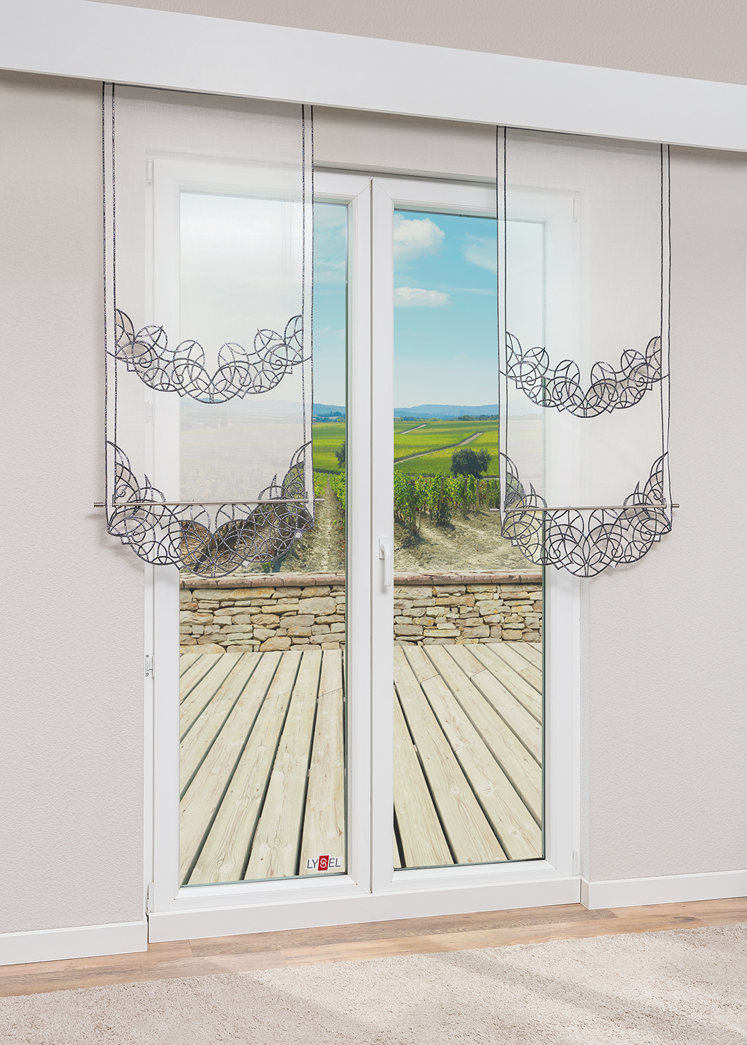 Mit einem geschwungenen bogenförmigen Abschluss, der sich als abstraktes, edel schimmerndes Muster erweist, aus verschiedenen Bögen und Kringeln besteht, sticht dieses Modell aus Plauener Spitze® von allen anderen Schiebegardinen hervor. Das angefügte Muster kommt hier zweimal vor, hebt sich je nach Farbgestaltung nur durch die Aussparungen und das Zusammenspiel der Linien ab. Besonders imposant wirkt es, wenn das Muster durch eine andere Farbe hervorsticht, und dem gesamten Design einen außergewöhnlichen Look verleiht. Da diese Schiebegardine wie hier als Stückware in Fertiggröße sowie als Rapportware erhältlich ist, lassen sich mit diesem Behang vielfältige Gardinenvariationen realisieren und Stoffe verschiedener Länge, etwa die Verbindung von Schiebegardinen und Scheibengardinen, zu einer individuellen Deko zusammenstellen.