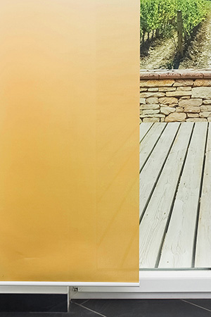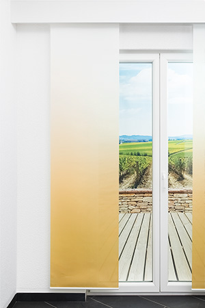 Eine ausgesprochen wirkungsvolle Fenstergestaltung bietet dieses Design mit ganzflächigem Farbverlauf. Oben weiß und unten farbig, hat dieser Farbverlauf insgesamt eine Höhe von 280 cm. Die Konfektionierung wird jeweils von unten, also vom farbigen Bereich aus vorgenommen. Der robuste, leinenartig gewebte Stoff ist leicht durchsichtig und lichtdurchlässig und in 6 kräftigen Trendfarben wählbar. Der Farbverlauf ist von innen aufgedruckt und nur leicht von außen sichtbar.