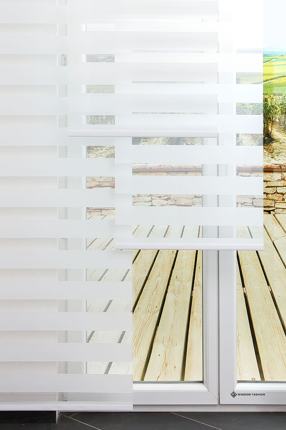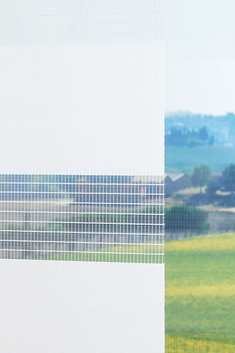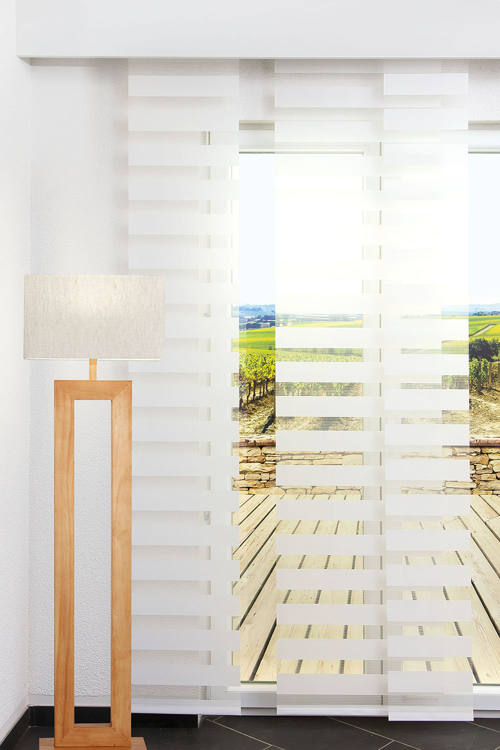 Auch dieser Flächenvorhang überzeugt durch die abwechselnd durchsichtigen und undurchsichtigen Gewebestreifen. Das Gewebe besitzt eine leicht grobe Struktur, die der Erscheinung eine besondere Note verleiht. Farblich wird Ihnen mit Verkehrsweiß helles Design geboten, das sowohl edel als auch neutral wirken kann und beinahe überall eine gute Figur macht.