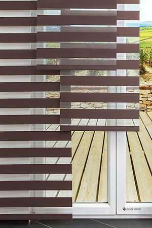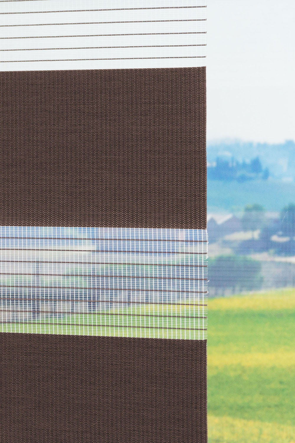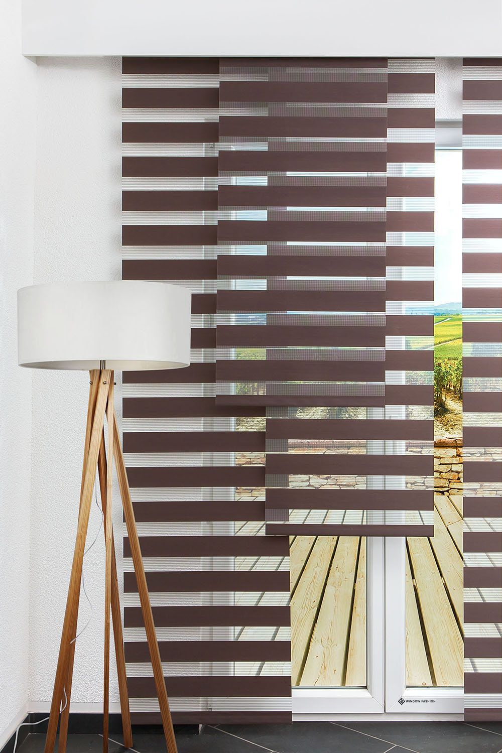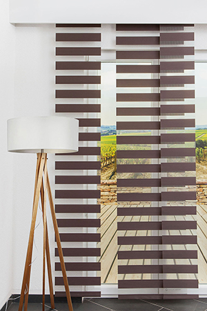 Auch dieser Flächenvorhang überzeugt durch die abwechselnd durchsichtigen und undurchsichtigen Gewebestreifen. Das Gewebe besitzt eine leicht grobe Struktur, die der Erscheinung eine besondere Note verleiht. Das dunkelbraune, fast schwarz anmutende Gewebe sorgt für einen besonderen Blickfang im Raum. Der Mut zu Farbe und Veränderung wird belohnt. Trotz der dunklen Farbwahl wirkt der Flächenvorhang nicht schwer oder plump. Die im Wechsel angeordneten transparenten und blickdichten Stoffstreifen bringen Leben ins Spiel. Der dunkle Stoff bringt helle Farben zum Leuchten. Auflockerungen schaffen Sie durch gelbe Nuancen oder Pastelltöne.