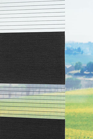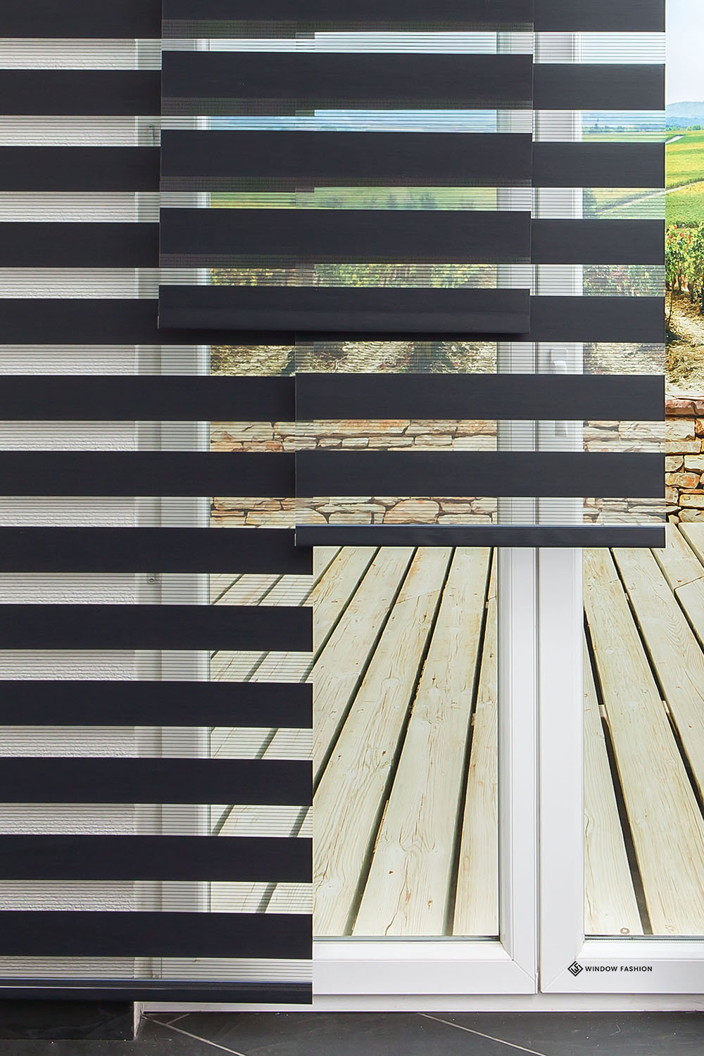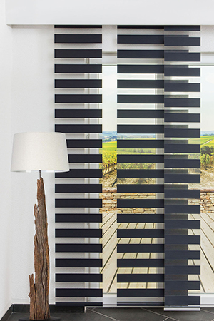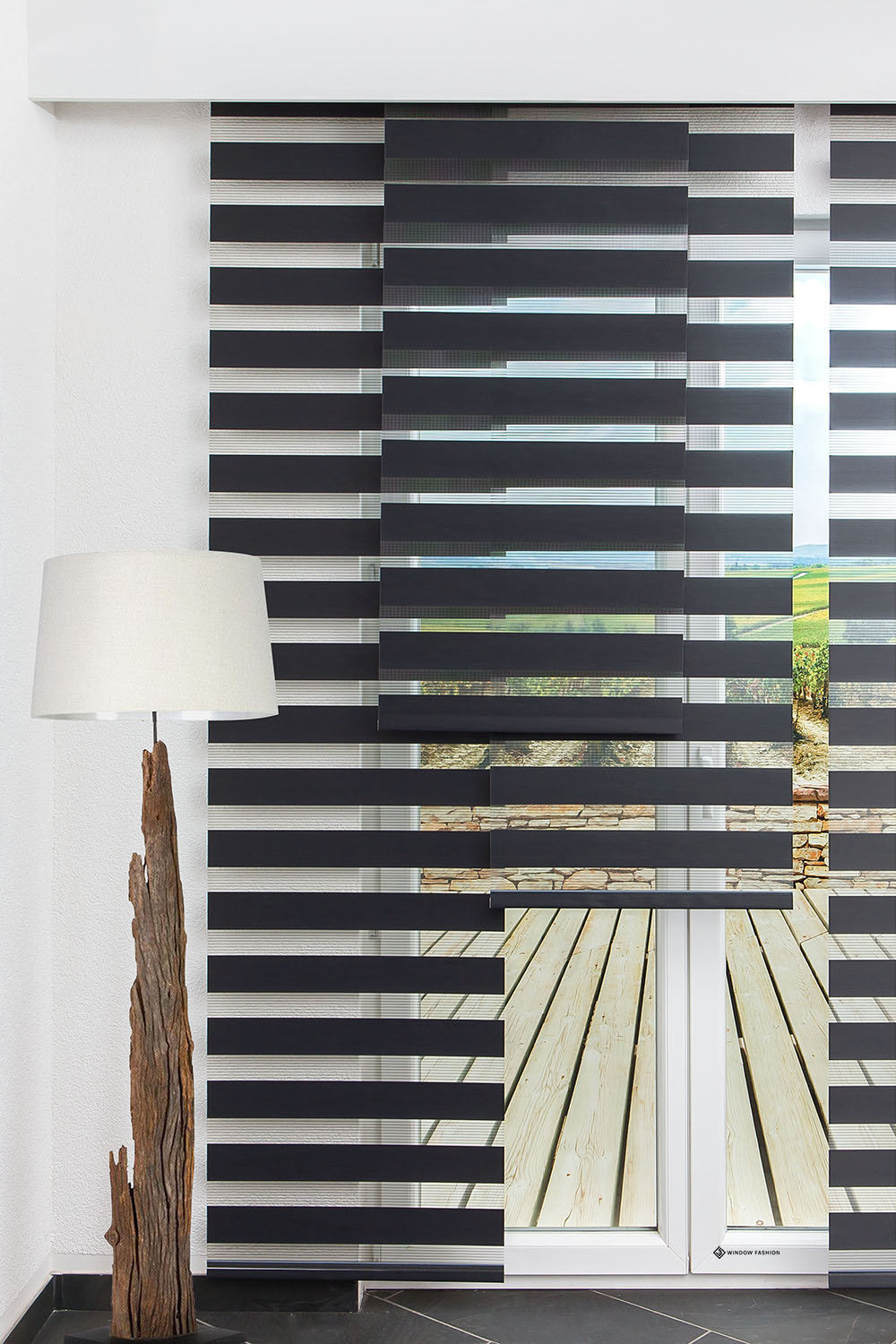 Auch dieser Flächenvorhang überzeugt durch die abwechselnd durchsichtigen und undurchsichtigen Gewebestreifen. Das Gewebe besitzt eine leicht grobe Struktur, die der Erscheinung eine besondere Note verleiht. Im geschlossenen Zustand filtert dieser Flächenvorhang den größten Teil des einfallenden Lichts und kann somit gut in Schlafzimmern eingesetzt werden. Farblich wird Ihnen mit Signalschwarz die Grundlage für ein Spiel mit Kontrasten geboten.