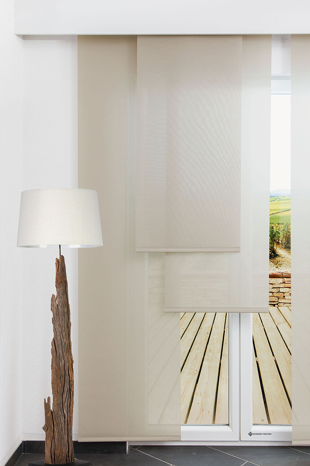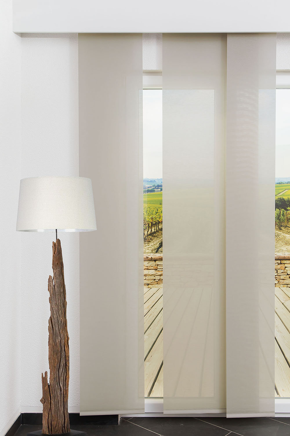 Durch die feine, leicht gerippte Struktur dieses durchsichtigen Flächenvorhangstoffes kann viel Licht ins Zimmer Fallen, was nicht nur für die Raumhelligkeit von Vorteil ist, sondern auch den dekorativen Effekt mit sich bringt, die Farbe der Schiebegardine bei Sonnenlicht zum Leuchten zu bringen. Mit dem Flächenvorhang legt sich ein zarter Schleier über das Fenster, welcher das einfallende Licht tönt ohne den Raum merklich zu verdunkeln. Funktional bietet der Stoff leichten Sichtschutz. Zudem kann er auch in Feuchträumen wie etwa Bädern eingesetzt werden. In hellem Grau tritt diese Schiebegardine selbst dezent in den Hintergrund. Es kann nüchterne Einrichtungen ergänzen ohne aufzuregen oder Räumen, die mit Farbe spielen ein wenig Ruhe verleihen.
