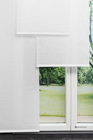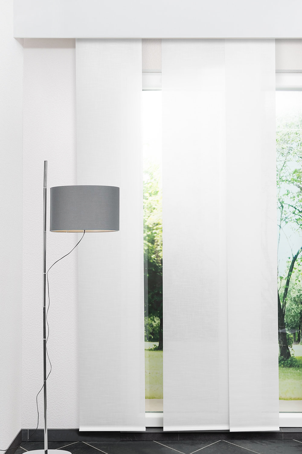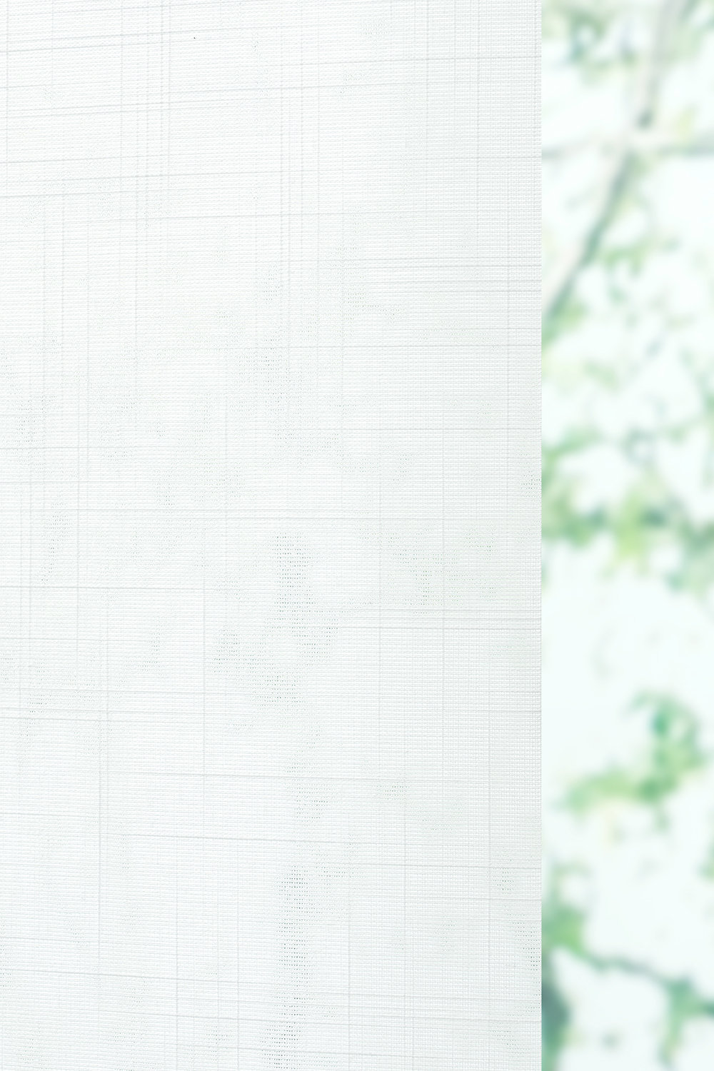 Das feine, an das Naturmaterial Leinen erinnernde Gewebe dieses unifarbenen Flächenvorhangs lässt viel Licht hindurch, die transparente Fensterdeko trägt zu einem freundlichen und einladenden Ambiente bei, wofür die Helligkeit im Raum ein wesentlicher Faktor ist. Der Flächenvorhang legt sich wie ein zarter Schleier über das Fenster, welcher blendende Sonnenstrahlen milder erscheinen lässt, hauptsächlich jedoch dekorative Zwecke erfüllt, keinen Sichtschutz bietet. Da das Gewebe hoher Wärme und Luftfeuchtigkeit in Form von Dampf und Dunst standhält, ist das Modell in Bad und Küche ebenfalls verwendbar, lässt sich durch simples feuchtes Abwischen schnell reinigen. Die Gestaltung in frischem Reinweiß unterstreicht die filigrane Zartheit und Luftigkeit des Gewebes. Der helle, entspannte Ton trägt zu einem harmonischen, ausbalancierten Ambiente bei und lässt sich toll für Farbkontraste und das Spiel mit Mustern verwenden. Dieser Flächenvorhang in Weiß verleiht jedem Raum einen frischen Look.