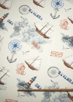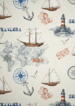 Auf dem Stoff in hellem Creme muss man die maritimen Elemente nicht lange suchen. Durch ihre Gestaltung in dunklen Blautönen, Braun und Rot wecken sie sofort die Aufmerksamkeit des Betrachters und zeigen, wo der Kurs hingehen soll. Weitere Erdtöne und viel Weiß können den Look harmonisch ergänzen.