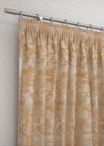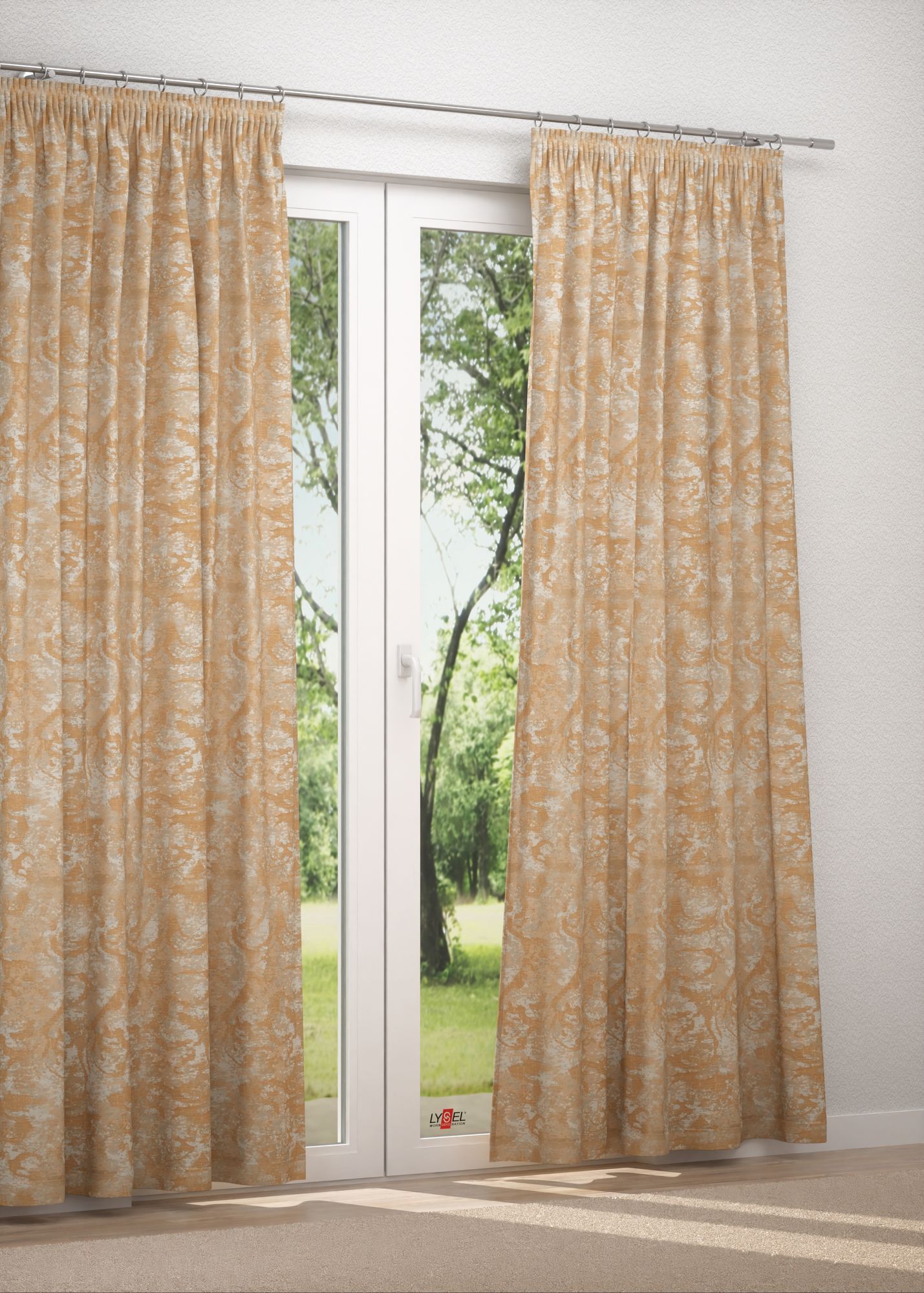 Dieser Stoff fällt durch seine Struktur und die zugleich edel wie natürliche wirkende, abwechslungsreiche Optik auf. Das glänzende und geschmeidige Material wurde mit an Ornamente erinnernden, geschwungenen Formen verziert, die sich stets in einer Farbwelt bewegen und teilweise ineinander überzugehen scheinen. Momente eines floralen Musters bringt das Design ebenfalls mit. Auf der Rückseite ist es in Negativ-Optik zu sehen. Der lichtdurchlässige, blickdichte Polyesterstoff lässt sich schonend bei 30 Grad reinigen. Seiten und Abschluss sind gesäumt.