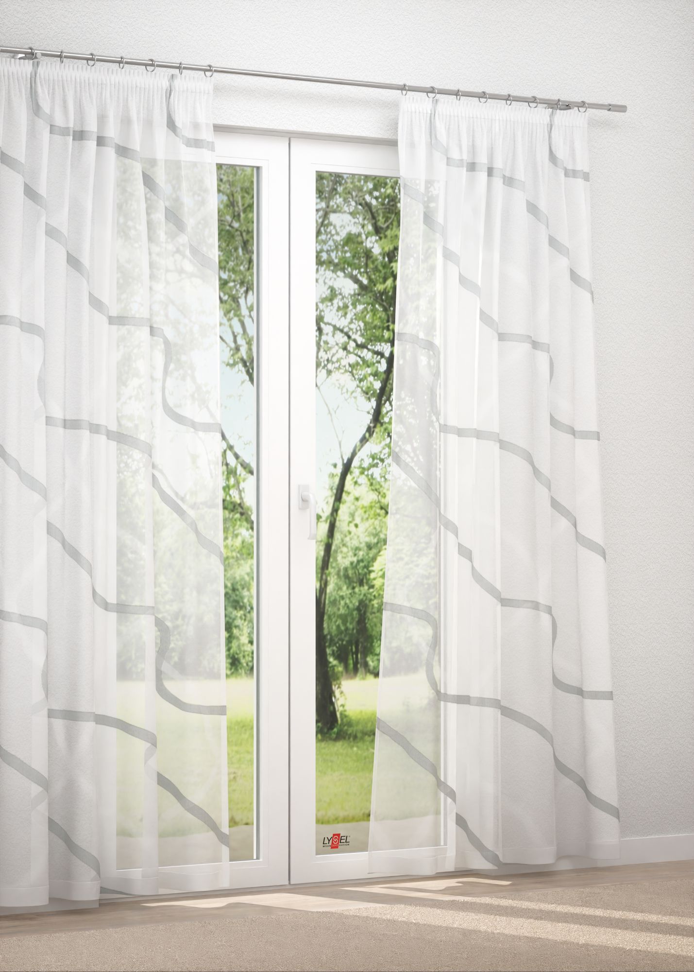 Mit aufwendiger Scherli-Technik wurde das abstrakte Muster in diesen unifarbenen Stoff eingefügt. Dabei hebt es sich aufgrund seiner plastischen Optik und der abweichenden Farbe von dem fein strukturierten Polyestergewebe ab. Breite Linien mit für diese Webart typischen ausgefransten Rändern ziehen sich durch den Stoff und lassen bei genauem Hinsehen außerdem ein feines Streifenmuster erkennen. Das zurückgenommene, abstrakte Design liefert die Basis für die Gestaltung vieler Accessoires. Als transparente Fensterdeko macht der Stoff eine besonders gute Figur. So kommt durch ein Raffrollo oder einen Gardinenschal nach Maß viel Licht hindurch und das Ambiente wirkt offen und freundlich. Diese Produkte können Sie im Konfigurator individuell zusammenstellen, dabei neben den Maßen unter anderem die Aufhängung festlegen. Als Basis für Tischwäsche eignet sich dieser Stoff ebenfalls, die Meterware erlaubt die Herstellung von Accessoires mit persönlicher Note.