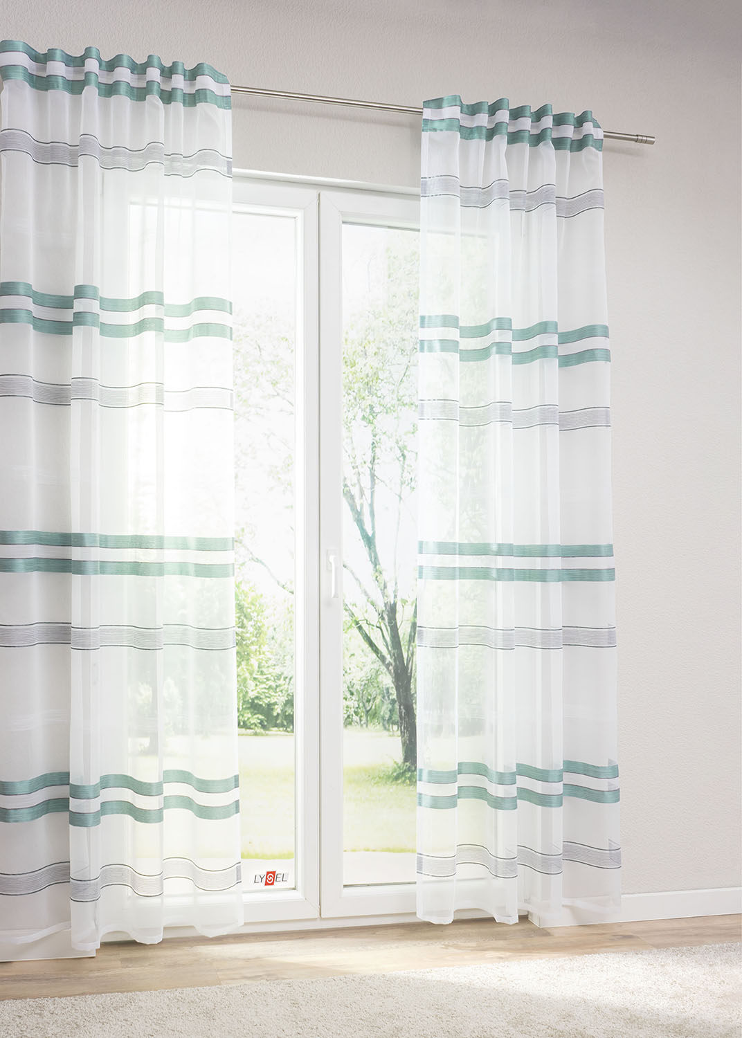 Dieser Zugbandschal setzt das klassische Streifenmuster modern in Szene. Die waagerechten Streifen bestehen wiederum aus feinen Linien. Jeweils zwei Streifen derselben Farbe sind mit einem transparenten Bereich dazwischen angeordnet. Darauf folgt ein Streifen einer anderen Farbe. Dabei ist das Streifenpaar innen, der einzelne Streifen oben und unten mit einem weiteren feinen Streifen verziert. Dieses Schema wiederholt sich über den gesamten Stoff hinweg. Durch die unterschiedlichen Streifen und die unterschiedlich breiten Bereiche dazwischen wirkt das Design harmonisch und lebendig zugleich. Das transparente Polyestergewebe lässt viel Licht in den Raum, diesen optisch größer wirken. Durch die in den oberen Saum integrierten Raffbänder wirft der Stoff dezente Falten. An den Seiten und am Abschluss ist er gesäumt. Die Aufhängung erfolgt mit einem Schlaufenband. Gern kürzen wir das Modell für Sie auf die gewünschte Länge.