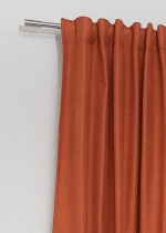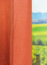 Ein sattes, warmes Braunorange umhüllt mit diesem Zugbandschal das Fenster. Dieser Orangeton wirkt weniger leuchtend, strahlend, mitreißend und fröhlich, vielmehr gediegen, mild, wohlwollend und wohnlich. Die warme Ausstrahlung der Farbe verfehlt ihre Wirkung dennoch nicht und verleiht dem Raum zusammen mit soften Tönen wie Creme, Ecru und Vanillegelb sowie hellem Grau eine geschmackvolle Ausstrahlung. Tiefes Nachtblau oder Anthrazit lassen den Raum in Verbindung mit Messingtönen edel wirken.