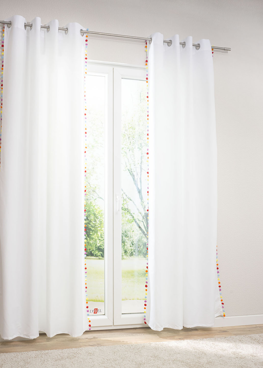 Die Bommeln reihen sich in Gelb, Orange, Rot, Pink und Blau aneinander und kommen in Verbindung mit dem unifarbenen Ösenschal in Weiß noch besser zur Geltung. Indem Sie durch Accessoires die Farben erneut aufgreifen und auf diese Weise das Kinderzimmer mit bunten Teppichen und Kissen dekorieren, wirkt das Ambiente stimmig, fröhlich und einladend.