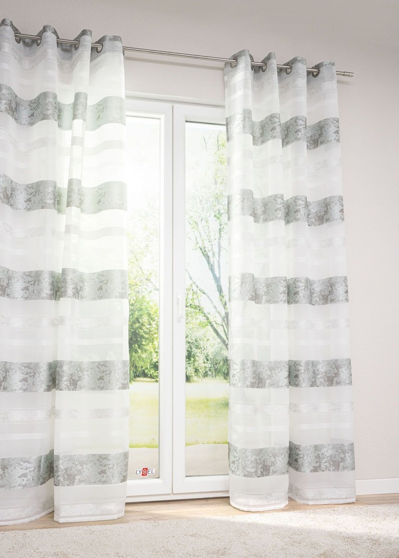 Dieser lichtdurchlässige Ösenschal zeigt breite Querstreifen, die in Abwechslung mit hellen Streifen starke Kontraste und ein lebendiges Design ergeben. Die bunten Bereiche stammen aus derselben Farbwelt, wirken harmonisch und sind mit einem dynamischen, sich teilweise kreuzenden Linienmuster gestaltet. Die Streifen gehen nicht ineinander über, sie sind wiederum durch schmale Streifen voneinander getrennt. Dieser abwechslungsreiche Mustermix macht den Ösenschal zu etwas Besonderem. Die großen Metallösen sind nicht nur Aufhängung, sondern auch Verzierung. Der lichtdurchlässige Polyesterstoff ist an den Seiten und am Abschluss gesäumt, kann schonend bei 30 Grad gewaschen werden. Ihm gelingt die perfekte Balance zwischen Helligkeit und Sichtschutz. Während weiterhin mildes Licht in den Raum kommt, werden neugierige Blicke stets abgeschirmt. Auf Wunsch kürzen wir die ausgewählte Fertiggröße auf eine passende, individuelle Länge.