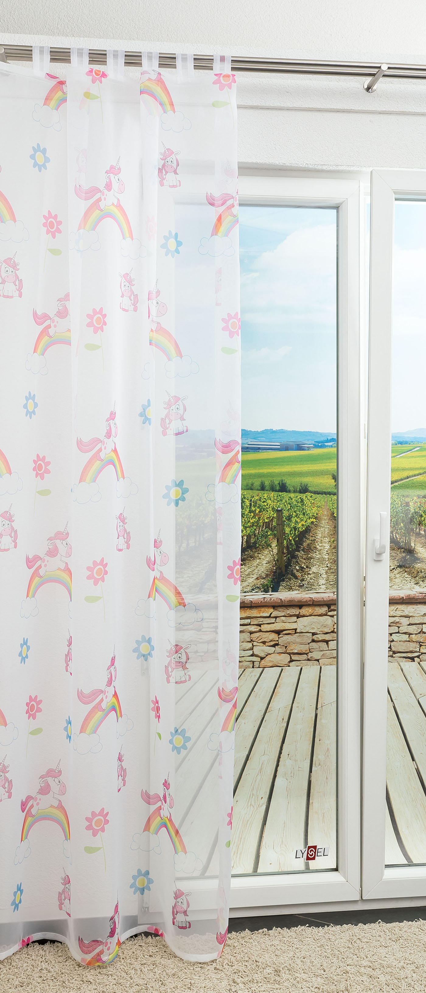 Der hauchzarte, transparente Schlaufenschal verzaubert das Kinderzimmer mit fröhlichen und fantasievollen Einhornmotiven, die bunt gestaltet auf der gesamten Oberfläche platziert sind. Dazu gesellen sich Regenbögen und Blumen, an welchen sich sowohl die magischen Tiere, als auch die Kinder erfreuen. Das feine Polyestergewebe lässt intensive Sonnenstrahlen etwas milder erscheinen, erfüllt dabei vornehmlich dekorative Zwecke. Durch den Lichteinfall wirkt der Raum optisch größer und offener. Seiten und Abschluss des Stoffes sind gesäumt; zudem lässt er sich schonend bei 30 Grad waschen.