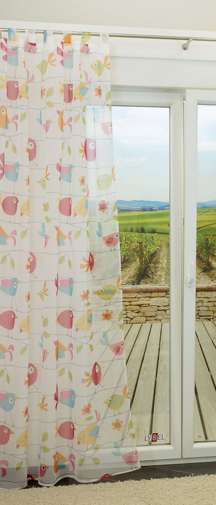 Mit seinem fröhlich-bunten Design ist dieser Schlaufenschal eine wunderbare Deko fürs Kinderzimmer. Auf zarten Ästen aufgereiht sitzen verschiedene Vögel untereinander, lassen den Raum zusammen mit den Blumen und Blättern aufleben, eine freundliche und lustige Atmosphäre entstehen. Das Muster nimmt die gesamte Oberfläche des Stoffes ein. Dennoch erscheint die Reihenfolge gleichmäßig, wirkt durchdacht und aufeinander abgestimmt. Das transparente Polyestergewebe lässt viel mildes Licht hindurch, der Raum wirkt optisch größer, zudem offen, freundlich und einladend. Dieser Effekt kommt besonders kleinen und im Norden liegenden Bereichen zugute. Den Schlaufenschal mit Tiermotiv können Sie leicht auf eine Gardinenstange aufziehen und bei Bedarf zusätzlich mit unifarbenen, blickdichten Gardinen kombinieren. An den Seiten und am Abschluss ist er gesäumt, lässt sich schonend bei 30 Grad mit der Hand waschen. Auf Wunsch kürzen wir die Fertiggröße auf eine passende, individuelle Länge.