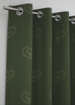 Der tiefdunkle Grünton lässt die Stickereien auf der Vorderseite besonders wirkungsvoll hervortreten. Auf der Rückseite sind diese in dunklem Grün, der Hintergrund in einem Beige-Grün gestaltet. Eine ruhige, entspannte und natürliche Aura gehen von dem Design aus, es wirkt gediegen und gemütlich. Sanfte Naturfarben wie Ecru, Creme und Beige, ebenso Kupfertöne und rötliches Holz setzen das Design perfekt in Szene.
