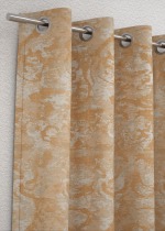 Dieser Stoff fällt durch seine Struktur und die zugleich edel wie natürliche wirkende, abwechslungsreiche Optik auf. Das glänzende und geschmeidige Material wurde mit an Ornamente erinnernden, geschwungenen Formen verziert, die sich stets in einer Farbwelt bewegen und teilweise ineinander überzugehen scheinen. Momente eines floralen Musters bringt das Design ebenfalls mit. Auf der Rückseite ist es in Negativ-Optik zu sehen. Der lichtdurchlässige, blickdichte Polyesterstoff lässt sich schonend bei 30 Grad reinigen. Seiten und Abschluss sind gesäumt.
