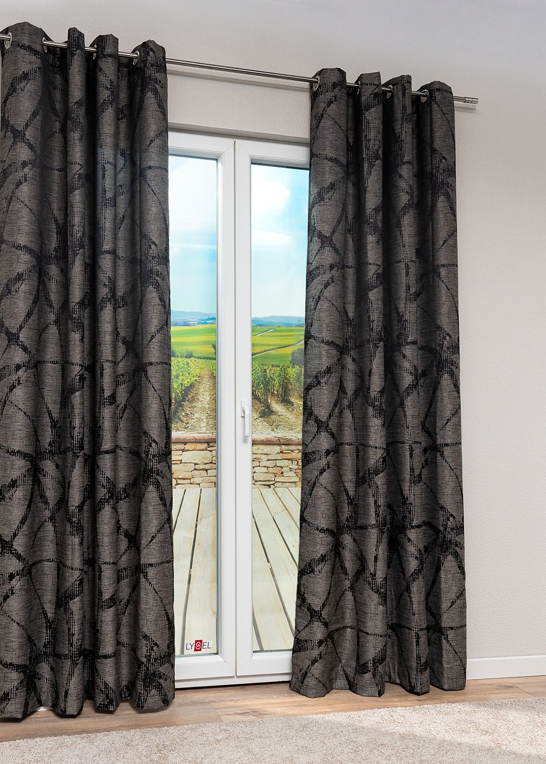 Schwarzgrau ist ein kraftvoller, dunkler Akzentton, der nicht nur Möbel und Accessoires wirkungsvoll betont. Auch Fenster können damit elegant umrahmt werden, wie Sie an diesem Ösenschal sehen. Als Umgebungsfarben profitieren vor allem Rosa, Bordeaux und andere Töne, die auf diese Weise dezent zum Leuchten gebracht werden können.