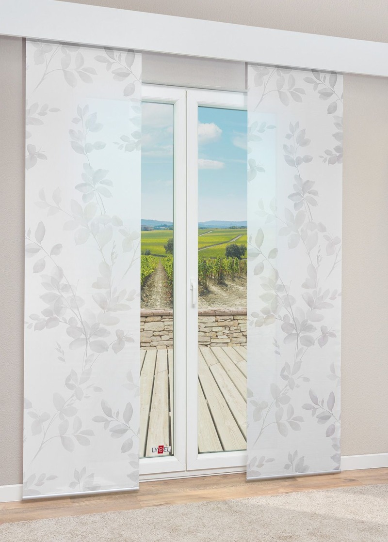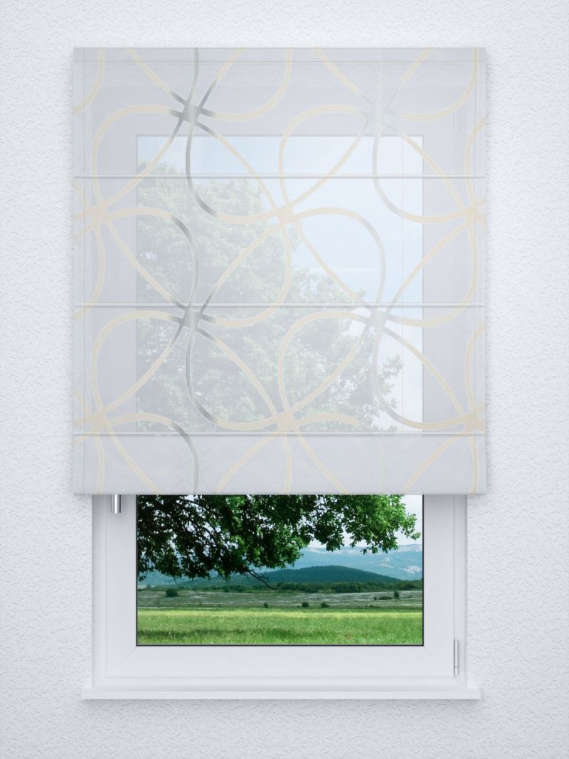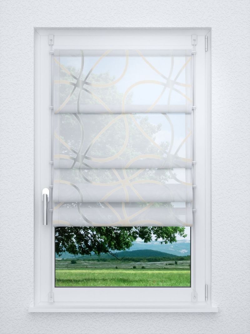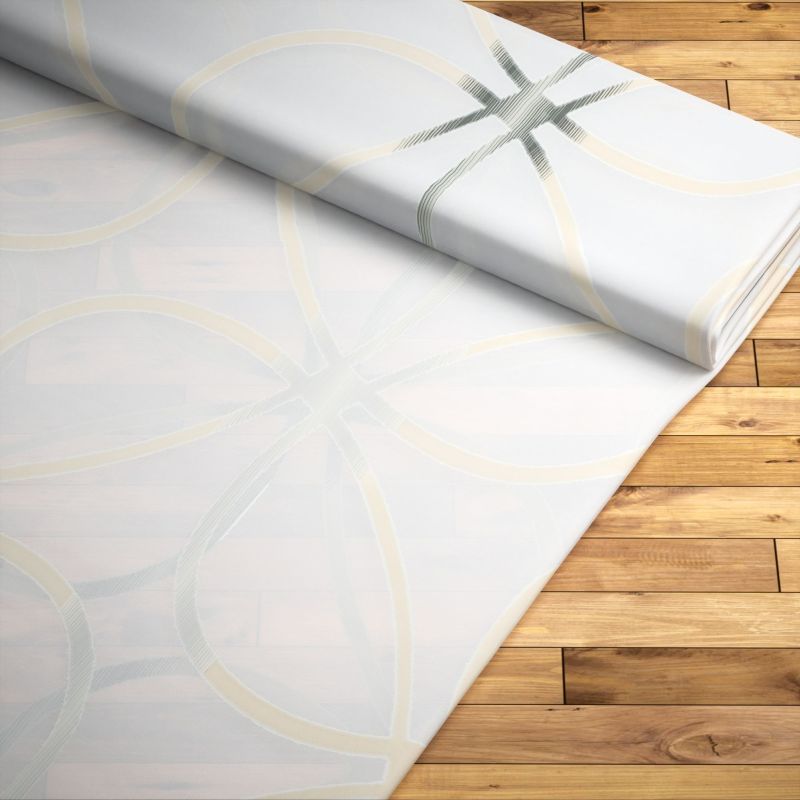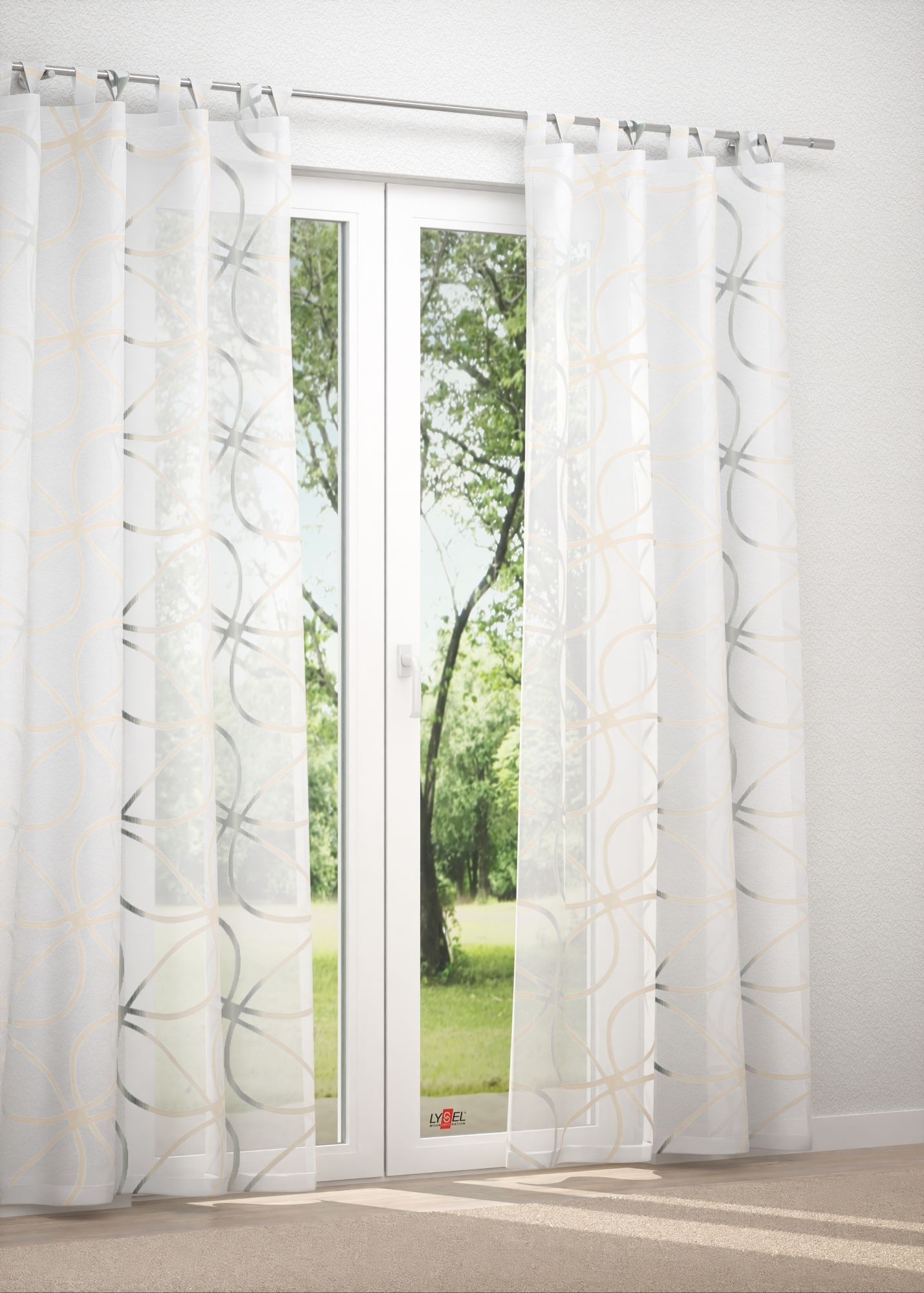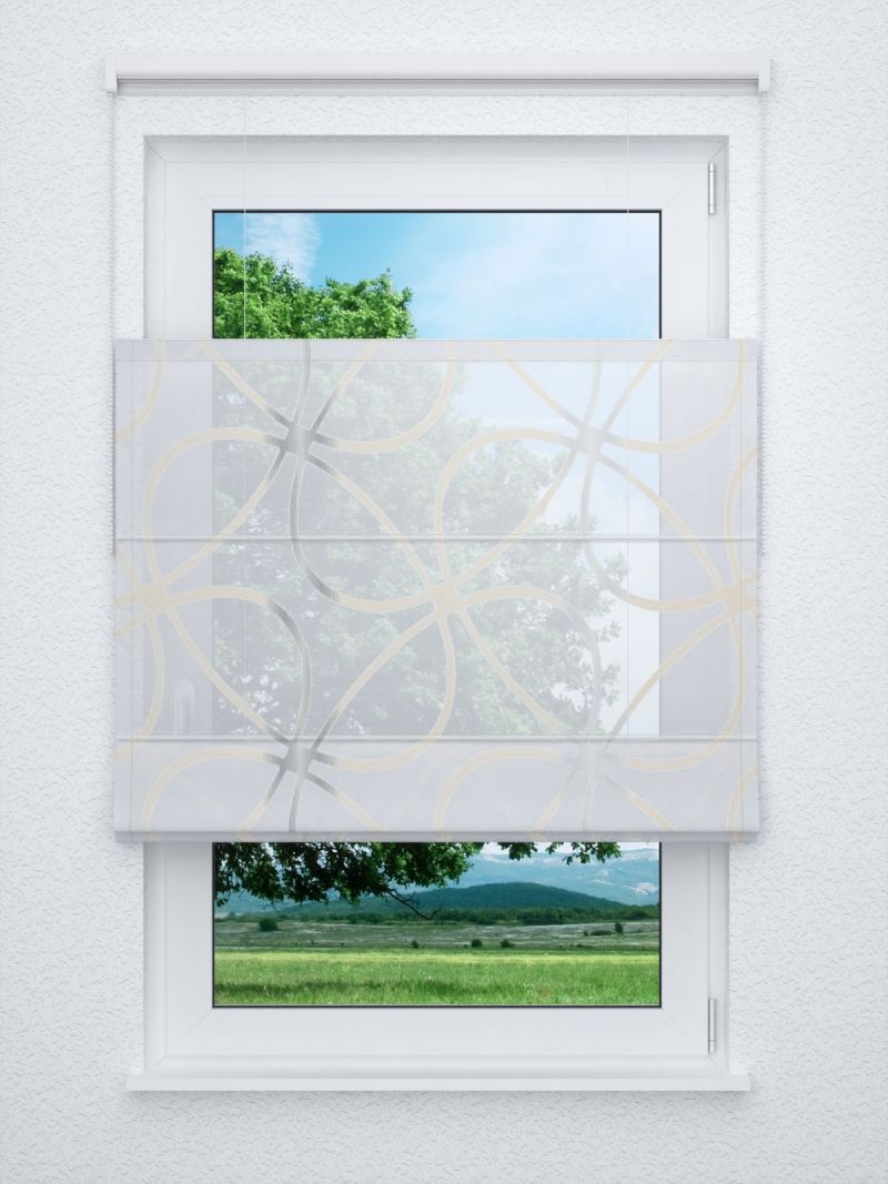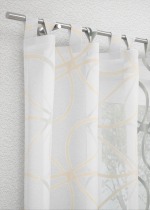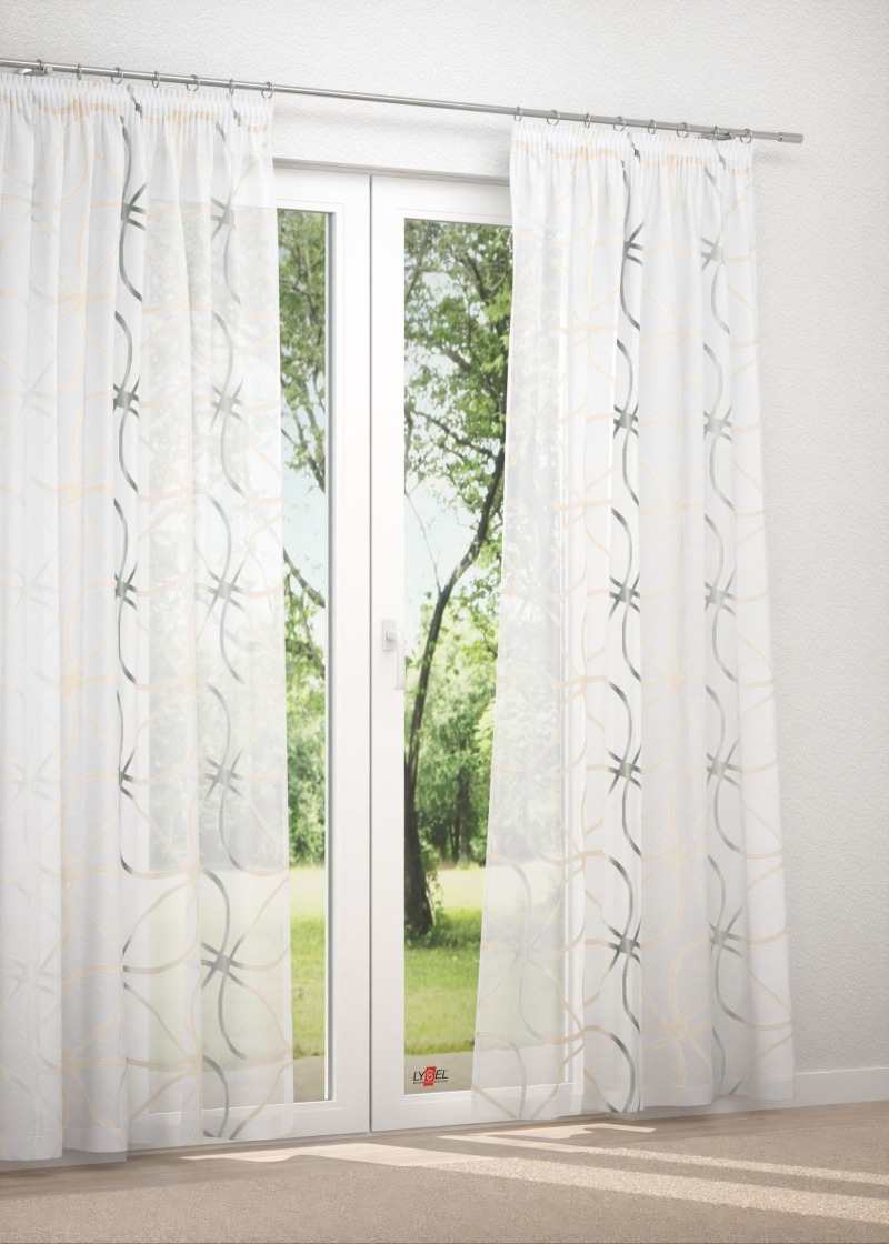 Das Design dieses Stoffes wird maßgeblich von dünnen, große Schlaufen bildenden Linien bestimmt. Da sie jeweils an einer Stelle zusammenlaufen, erinnern sie an große Blütenblätter, deren Zentrum mit zweifarbigen Schraffuren gestaltet ist. Die ausgefransten Ränder deuten darauf hin, dass es sich hierbei um ein Scherli-Muster handelt, das mit zusätzlichen Kett- und Schussfäden in den Stoff eingewebt wurde. Der transparente Polyesterstoff macht besonders als Fensterdeko eine gute Figur, er lässt viel Licht in den Raum, lediglich intensive Sonnenstrahlen erscheinen milder und etwas gedämpft. Ihr maßgefertigtes Raffrollo oder Ihren Gardinenschal nach Maß können Sie im Konfigurator individuell zusammenstellen. Für eine Tischdecke oder einen Tischläufer lässt sich der Stoff ebenfalls verwenden. Zusätzlich wird er als Meterware angeboten, sodass Sie auch eigene kreative Ideen umsetzen können.