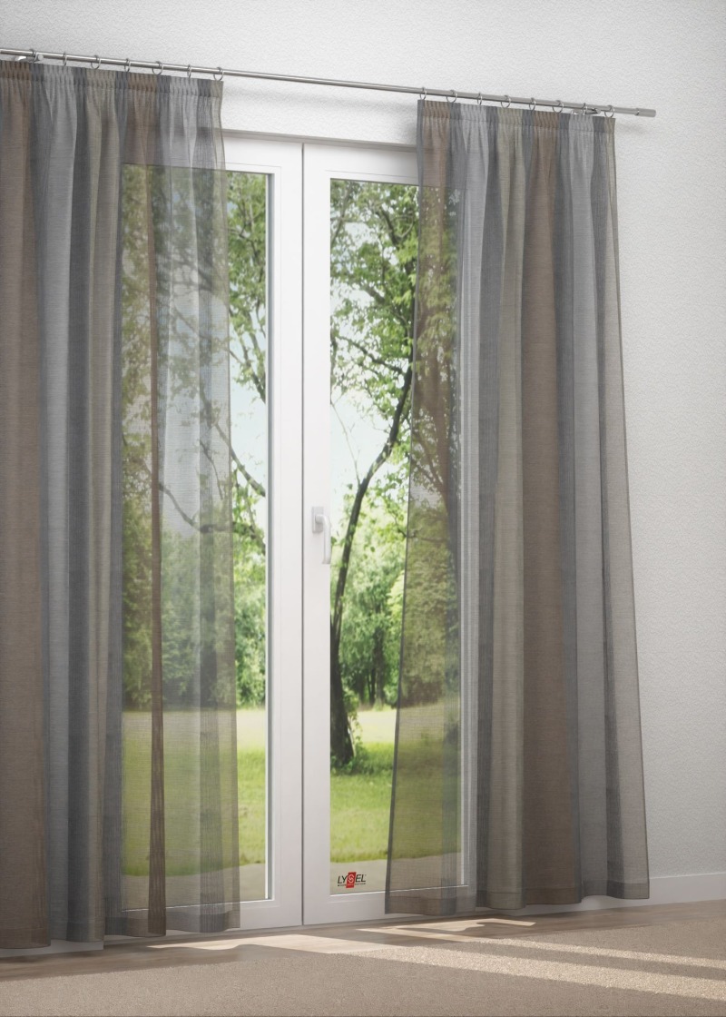 Bei diesem Stoff fallen zunächst die edel glänzenden, schmalen Streifen auf. Der Glanz entsteht, da das Gittermuster in eine Richtung durch ein Effektgarn verstärkt wurde. Durch die eng aneinander liegenden Streifen entsteht eine glänzende Vollfläche, die bei Bewegung bzw. Lichteinfall ihre ganze Wirkung offenbart. Am Rand des luftigen, transparenten Polyestergewebes wurde ein Bleiband eingefügt, welches den Fall des Stoffes positiv beeinflusst. Ob Raffrollo oder Gardinenschal, im Konfigurator können Sie sich Ihre Fensterdeko Schritt für Schritt zusammenstellen, neben den Abmessungen zum Beispiel auch die Aufhängung und die Form vom unteren Abschluss festlegen. Zusätzlich bietet die Meterware ideale Voraussetzungen für eine Tischdecke, einen eleganten Tischläufer oder andere Accessoires, bei denen Sie selbst kreativ werden können.