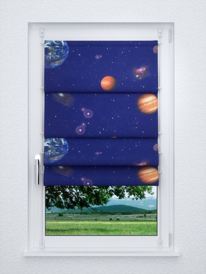 Eine Reise in die Galaxie, einen anderen Blick auf die Welt, das bietet das Design dieses Stoffes. Das Motiv ist auf die Vorderseite aufgedruckt, die Rückseite ist Weiß. Die verschiedenen Planeten wirken hier so nah und greifbar, so groß die Distanz in der Realität auch sein mag. Dazu versprüht der mit Sternen übersäte Himmel ein magisches Flair. Machen Sie eigene Gestaltungsträume wahr und kreieren Sie aus dem Stoff in Meterware individuelle Accessoires. Eine Fensterdeko, etwa ein maßgefertigtes Raffrollo oder ein Gardinenschal nach Maß, wirkt besonders imposant. Der Konfigurator bietet Ihnen viele Möglichkeiten, die Fensterdeko zu Ihrer werden zu lassen. Das lichtdurchlässige Polyestergewebe wurde per Transferdruck gestaltet und trägt zu einem offenen und freundlichen Raumambiente bei. Als Sichtschutz hält der Stoff tagsüber wie abends neugierige Blicke fern.