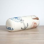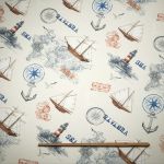 Auf dem Stoff in hellem Creme muss man die maritimen Elemente nicht lange suchen. Durch ihre Gestaltung in dunklen Blautönen, Braun und Rot wecken sie sofort die Aufmerksamkeit des Betrachters und zeigen, wo der Kurs hingehen soll. Weitere Erdtöne und viel Weiß können den Look harmonisch ergänzen.