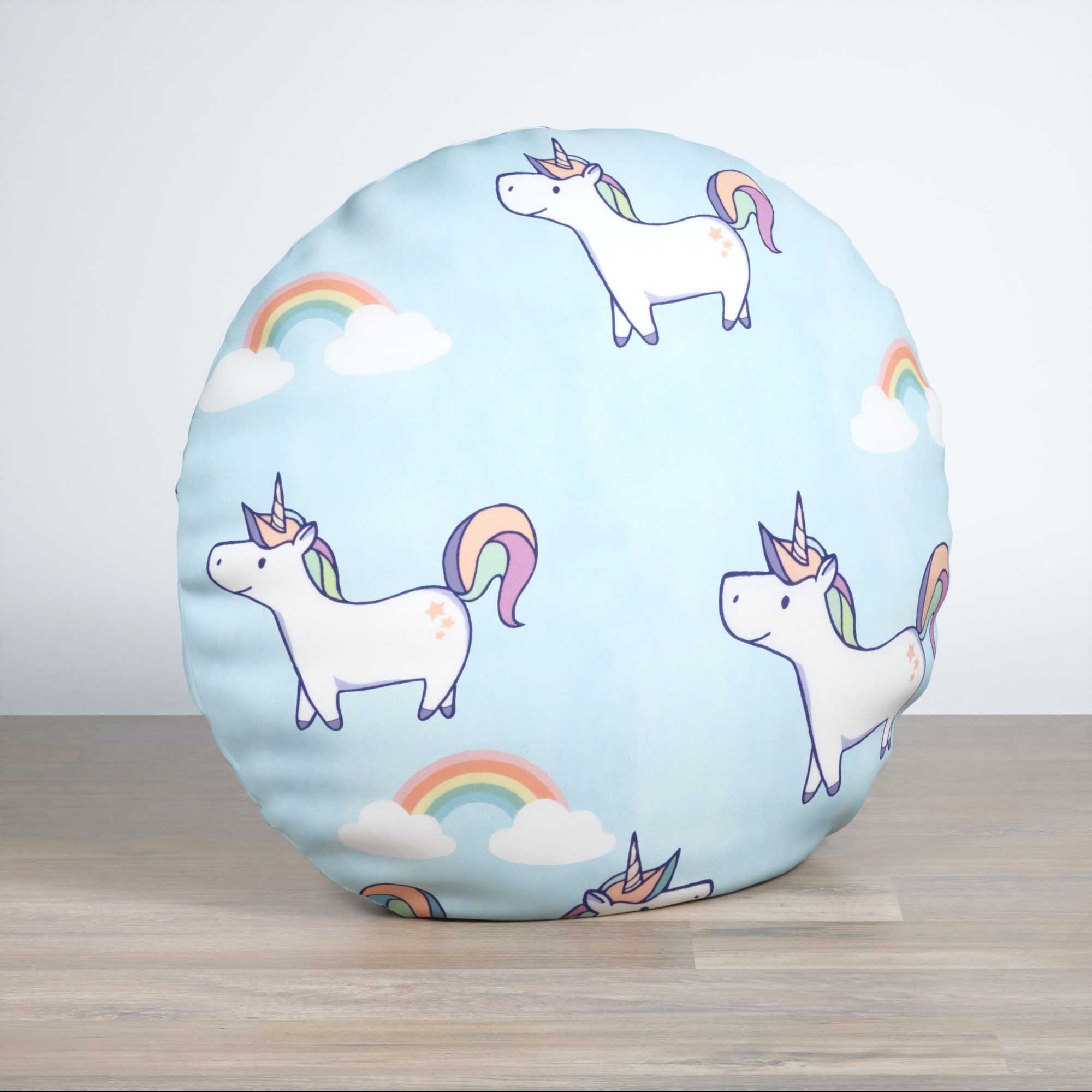 Die Einhörner sind mit Umrissen und Schraffuren in magischem Lila gestaltet. Dieser Ton findet sich neben Lindgrün, Himbeerrot und Orange auch im Schweif und in der Mähne wieder. Der Regenbogen ist in anderen leuchtenden Farben gestaltet, die wunderbar mit dem hellblauen Hintergrund harmonieren.