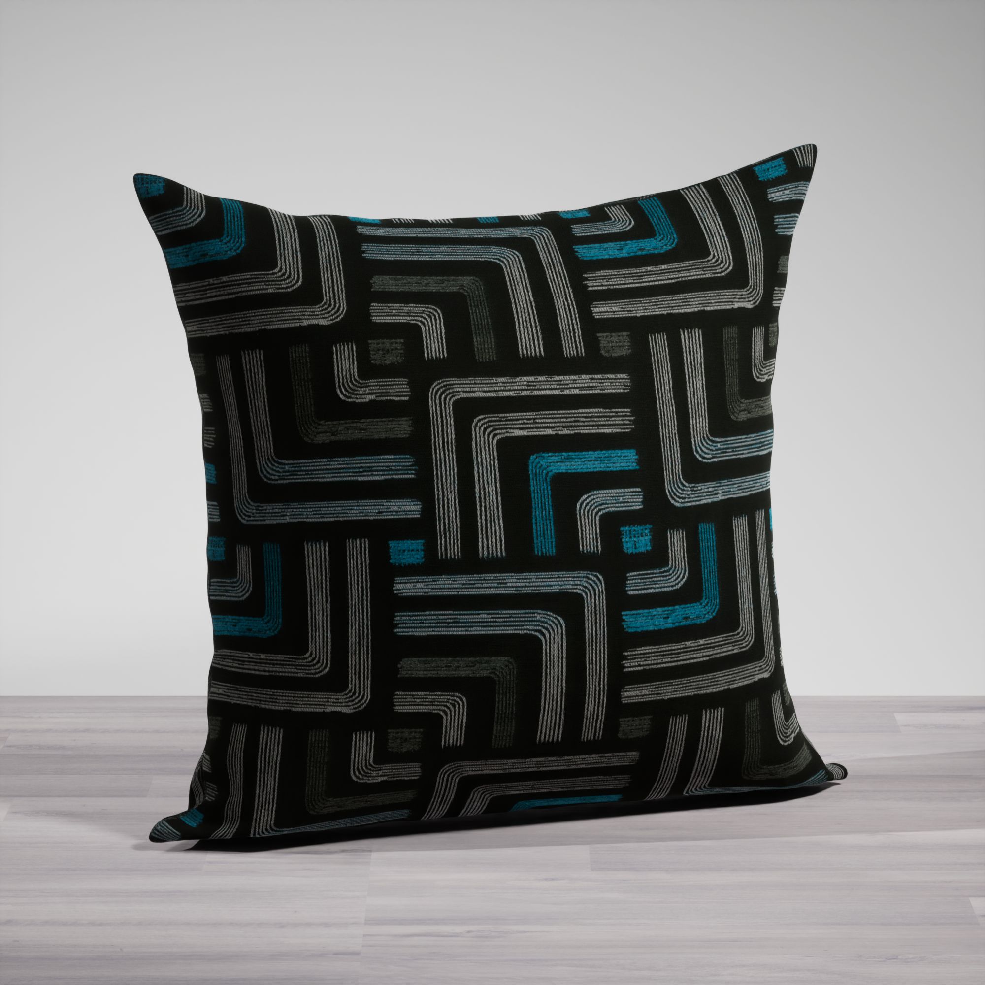 Dieser schwarze Kissenbezug ist mit Linien in verschiedenen Grautönen, Hellblau und Petrolblau verziert, wodurch das Design eine einzigartige, moderne Optik erhält. Besonders die Blautöne stechen hervor und verleihen dem Kissenbezug eine erfrischende, lebendige Note. Helle Graunuancen, frisches Weiß und verwandte Blautöne passen perfekt dazu. Warme Metallictöne wie Gold, Kupfer und Messing betonen das edle Flair.