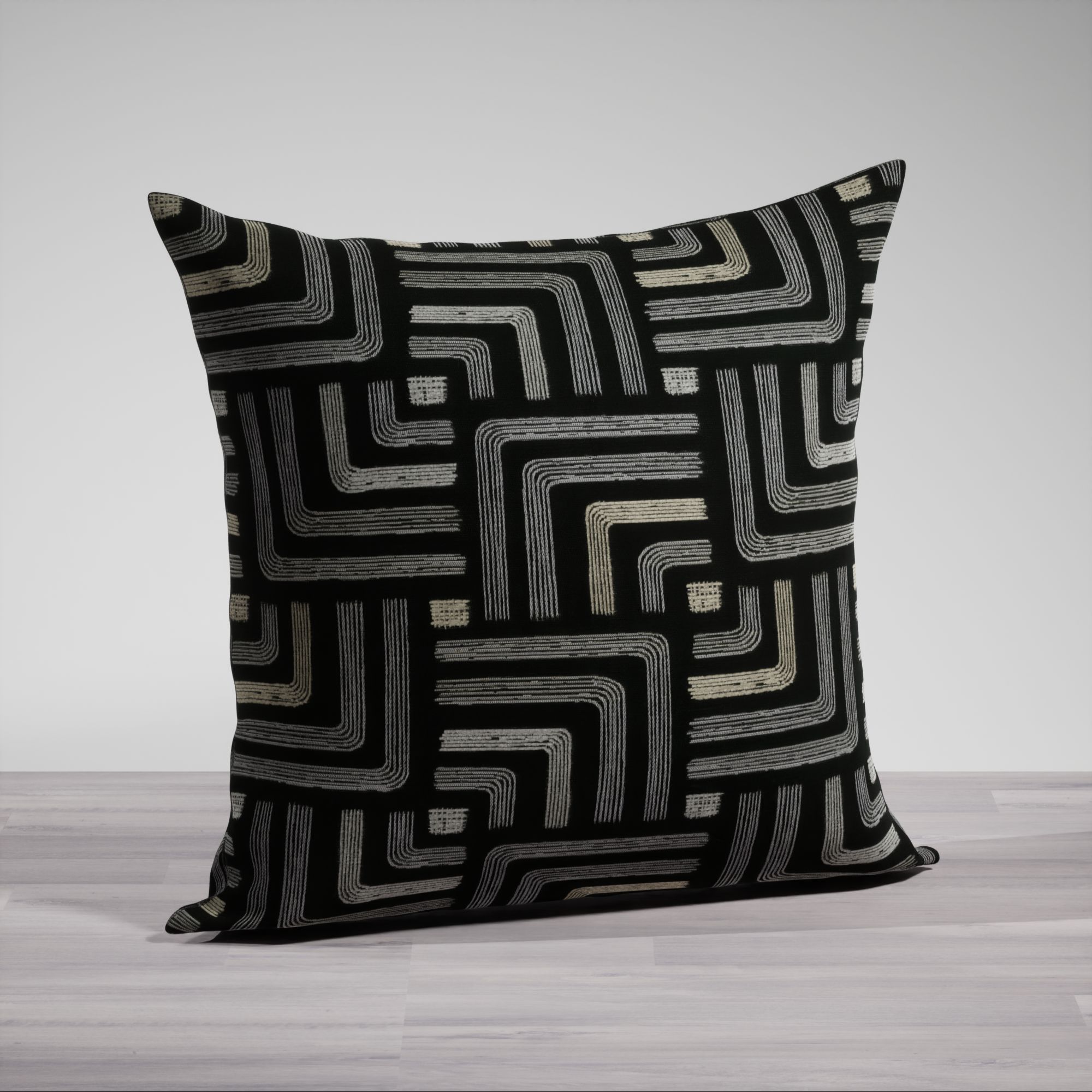 Von dem schwarzen Stoff der Kissenhülle hebt sich das in verschiedenen hellen Grau- und Beigetönen gestaltete Muster ausdrucksstark ab und verleiht dem Ambiente eine moderne Eleganz. Das Zusammenspiel der leisen, dezenten Töne kann ein im monochromen Stil gehaltenes Interieur geschmackvoll ergänzen. Somit können Sie verwandte Farbnuancen für die Deko nutzen, genauso passen kräftiges Senfgelb, Petrol und satte Beerentöne, die dem Kissendesign eine edle Umrahmung geben.