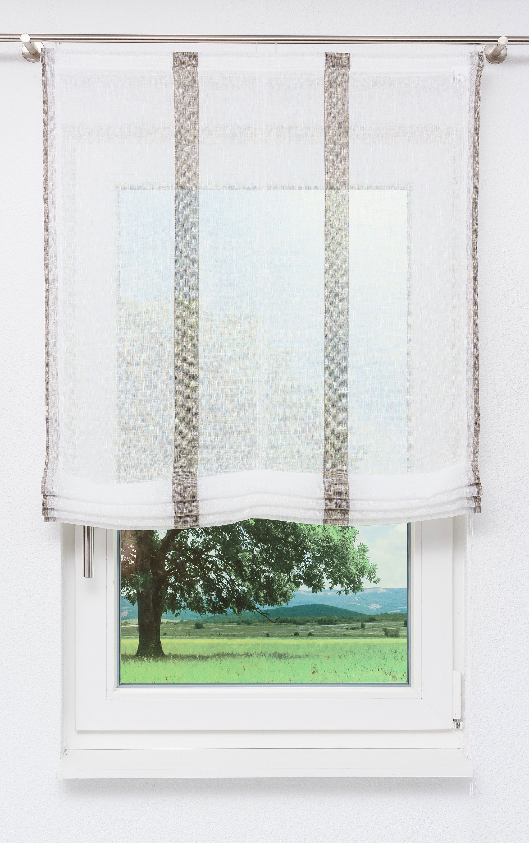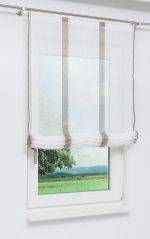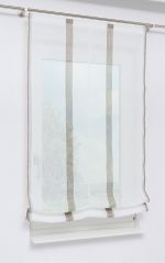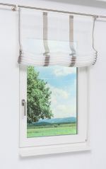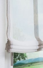 Dieses transparente Raffrollo in natürlicher Leinenoptik setzt sich aus hochwertigem Trevira CS Garn und Polyester zusammen. Während das durchscheinende Gewebe mit den senkrecht verlaufenden Streifen in sanften Naturfarben blendende Sonnenstrahlen milder erscheinen lässt, wirkt der Raum optisch größer, weiter und offener. Damit kann diese Fensterdeko auch zu einem freundlichen und einladenden Ambiente beitragen. Das gestreifte Raffrollo, dessen Aufhängung mittels Flexoschiene und Klettband erfolgt, können Sie bei 30 Grad schonend waschen. Damit zeichnet es sich auch durch seine pflegeleichten Eigenschaften aus. Die sich auf der rechten Seite befindende Zugschnur dient der individuellen Raffung des Rollos.