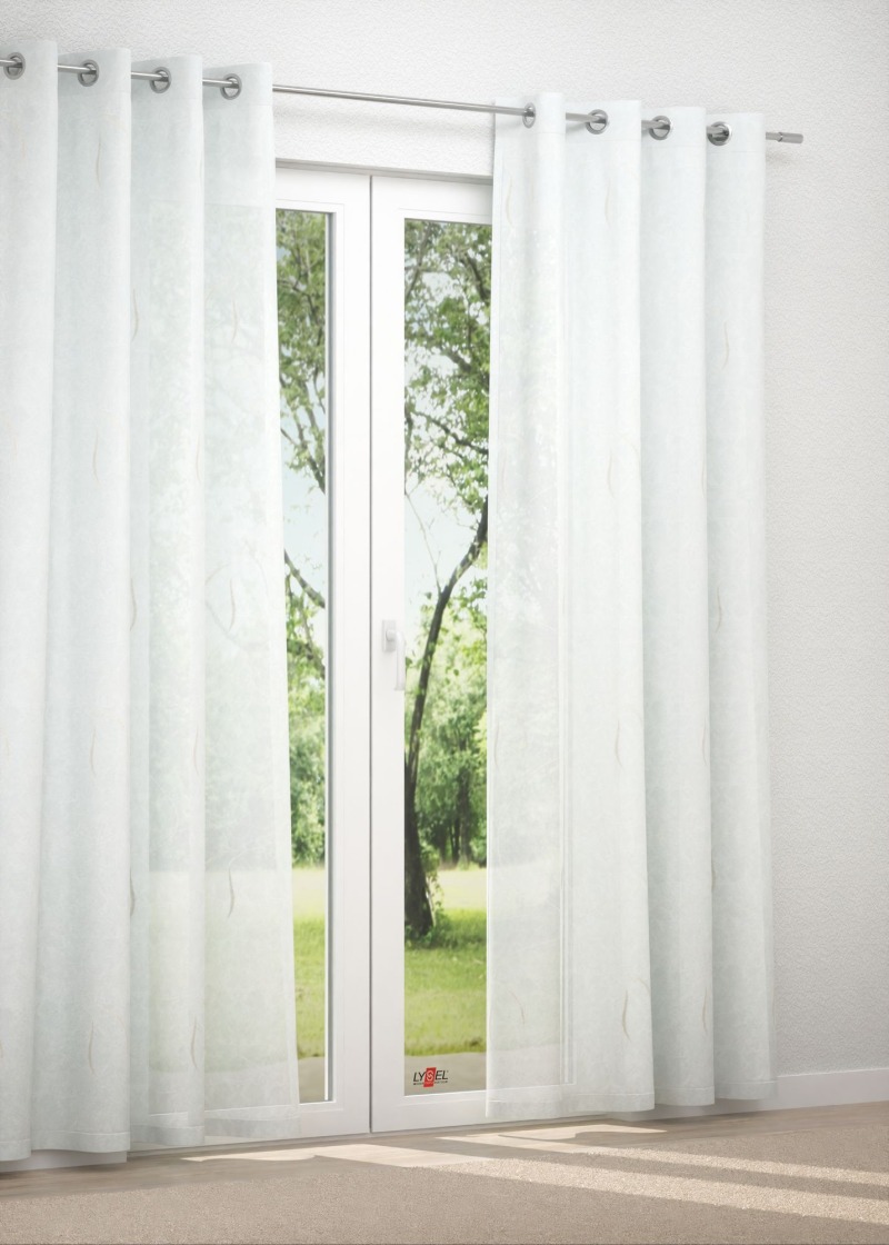 Fein und dezent wirkt dieser Voile Stoff mit reizvoller Crush-Optik und vielen glänzenden, floral geschwungenen Details. Das zarte, durchsichtige Polyestergewebe ist eine stilvolle und elegante Umrahmung, vor allem wenn es als Fensterdeko verwendet wird, bei der das eingefügte Bleiband für einen schönen Fall sorgt. Einen Gardinenschal oder ein Raffrollo können Sie im Konfigurator nach Maß zusammenstellen, dabei unter anderem die Aufhängung auswählen. Das transparente Polyestergewebe sorgt dafür, dass viel Licht in den Raum kommt, dieser offen und freundlich wirkt. Für einen geschmackvollen Tischläufer kann dieser Stoff ebenfalls verwendet werden. Die Struktur der Tischplatte bzw. die darunterliegende Tischdecke lässt er hervorkommen. Für die Umsetzung eigener kreativer Ideen bieten wir den Stoff auch als Meterware an.