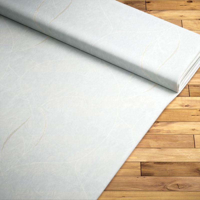 Der mit vielen silbernen Details verzierte weiße Stoff strahlt eine kühle Eleganz aus. Die Luftigkeit und Leichtigkeit werden durch den glänzenden, metallischen Ton unterstrichen. Greifen Sie Silber auch in der Dekoration auf. Spielen Sie außerdem mit verschiedenen Blau- und Grautönen oder greifen Sie die Zartheit des Behangs durch softe Pastellnuancen bzw. ruhige Grüntöne auf.