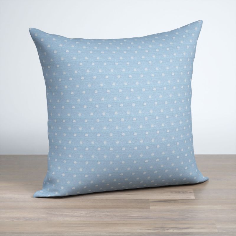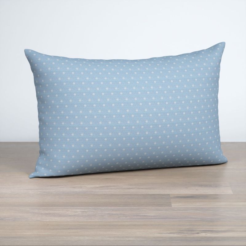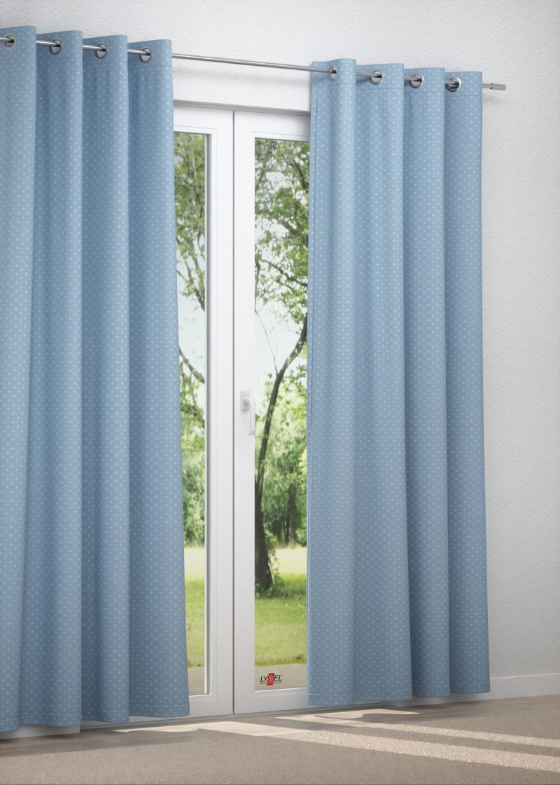 In sanftem Himmelblau bringt der Stoff eine angenehme Ruhe in den Raum. Der leise und gedeckte Ton verbreitet gleichzeitig eine behagliche Atmosphäre und schenkt dem Interieur ein freundliches und frisches Flair. Dazu tragen auch die schimmernden Punkte bei. Weitere Blau- und Grautöne passen hierzu besonders gut; helle oder rötliche Holzmöbel und Textilien in Nude sorgen für den wohnlichen Charakter.