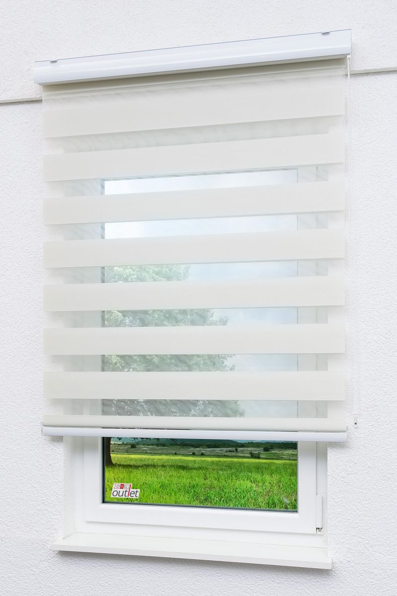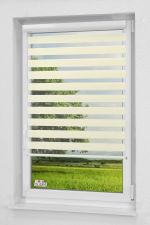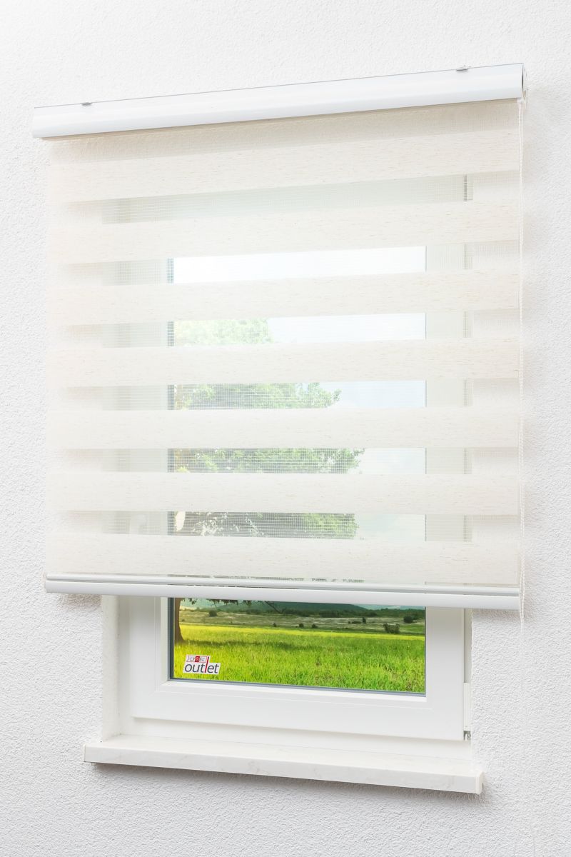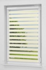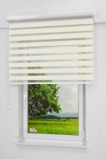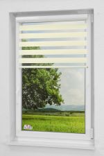 Doppelt gelegter Behang und horizontale Streifen sind das "Markenzeichen" von Doppelrollos. Die Streifen sind abwechselnd transparent und undurchsichtig-farbig gehalten und werden bei Bedarf mit der Bedienkette so übereinander geschoben und ergänzt, dass eine halb offene oder eine Blickdichte Fläche entsteht. Die Bedienung geschieht stufenlos, womit immer das richtige Mischverhältnis zwischen Tageslicht und Sichtschutz herrscht. Durch die geringe Streifenbreite ist der Weg zum Sichtschutz im Bedarfsfall besonders kurz. Vor allem Orte an denen immer wieder schnell Sichtschutz hergestellt werden muss, wie etwa Bäder und Schlafzimmer, profitieren von der durchdachten Funktionalität. Die Rollowelle samt Stoff und Mechanik liegen gut geschützt in einer Kassette, die zugleich einen besonders attraktiven wie wertigen Abschluss bildet. Das mitgelieferte Zubehör für die Montage erlaubt die Befestigung an Wand, Decke oder direkt auf dem Fenster mittels Klebestreifen. Ebenfalls ist es möglich, dazu passende Pendelsicherungen zum Klemmen oder Kleben separat zu bestellen.