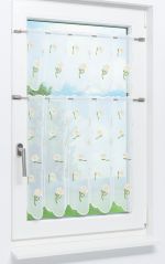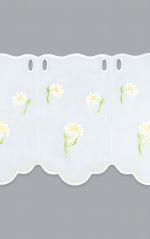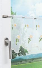 Mit ihrer schönen Bestickung vermitteln die Scheibengardinen aus Plauener Spitze® geschmackvolle Akzente. Modern und stilvoll punktet das Design mit aufgestickten Margeriten. Befestigt wird die Scheibengardine unkompliziert an einer Gardinenstange. Die Gardine ist pflegeleicht und darf im Schonwaschgang bei 30° C in die Waschmaschine.