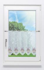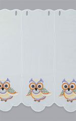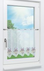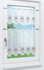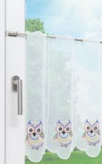 Die am unteren Rand sitzenden, fröhlich-bunten Eulen mit weit aufgerissenen, runden Augen sind auf der ansonsten in schlichtem Weiß gestalteten Scheibengardine echte Hingucker. Die leuchtenden, auffälligen Farben und die abwechslungsreichen Muster machen dieses Modell zu einer lustigen Deko fürs Kinderzimmer. Sie animiert zum Spielen, Toben, Ausgelassen- und Fröhlichsein. Zudem ist der untere, wellenförmige Abschluss mit kleinen, schleifenähnlichen Gebilden verziert und sorgt nochmal mehr für einen verspielten Look. Durch die transparente Bistrogardine mit Tiermotiv kommt viel Licht in den Raum, dieser wirkt offen, freundlich und einladend. Dabei kann sie wunderbar mit unifarbenen, blickdichten Stoffen kombiniert werden. Die Bistrogardine mit praktischem Stangendurchzug wird einfach ins Fenster gehängt. Dieses Modell ist in verschiedenen Höhen und Breiten erhältlich; Spannvitragen, Klemm- und Pinnstangen finden Sie ebenso wie Klebehaken und Klemmträger hier im Shop.