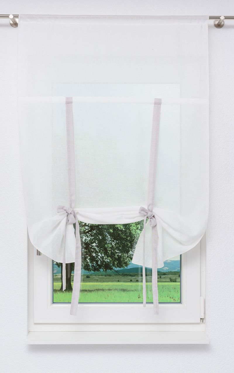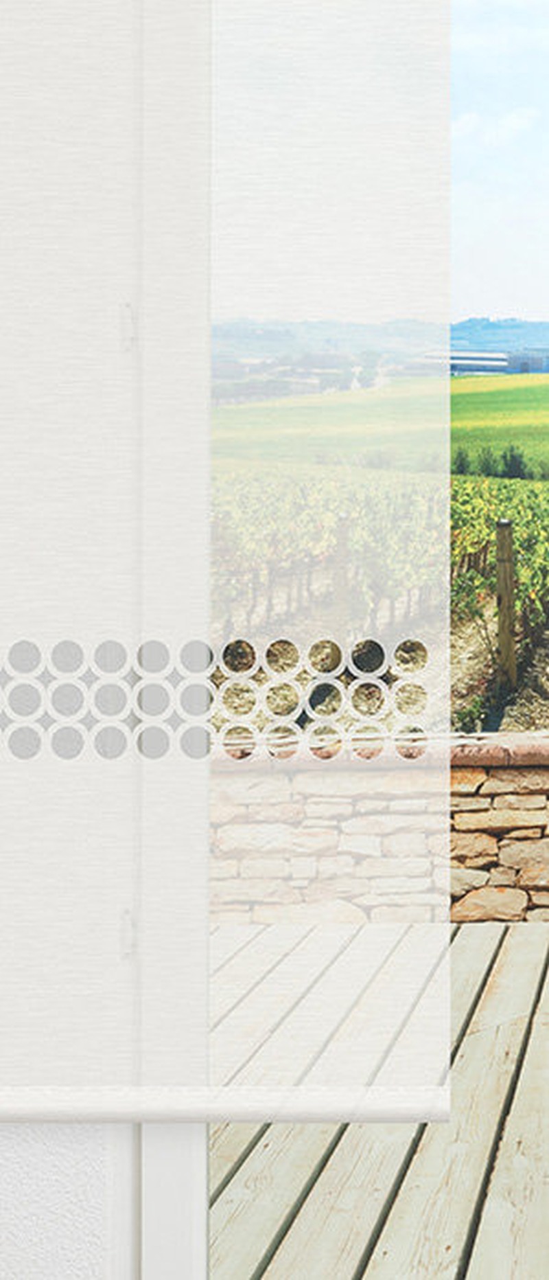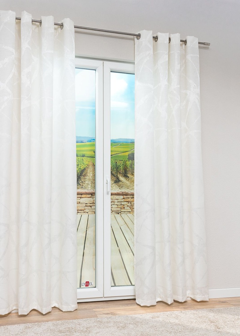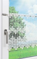 Die Gestaltung in Reinweiß unterstreicht die Luftigkeit und Zartheit des Behangs. Ähnlich einer wertvollen Perlenkette reihen sich die Kordeln und die kugelförmigen Elemente aneinander. In eine Wohnumgebung, die mit viel naturbelassenem Holz gestaltet ist, passt das Design ausgesprochen gut. Weiterhin können Sie die Scheibengardine mit allen Farben in Szene setzen, von romantisch-pastellig, über erdig und sanft bis hin zu knallig und extravagant, wobei dann die Scheibengardine subtil im Hintergrund wirkt.